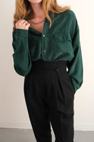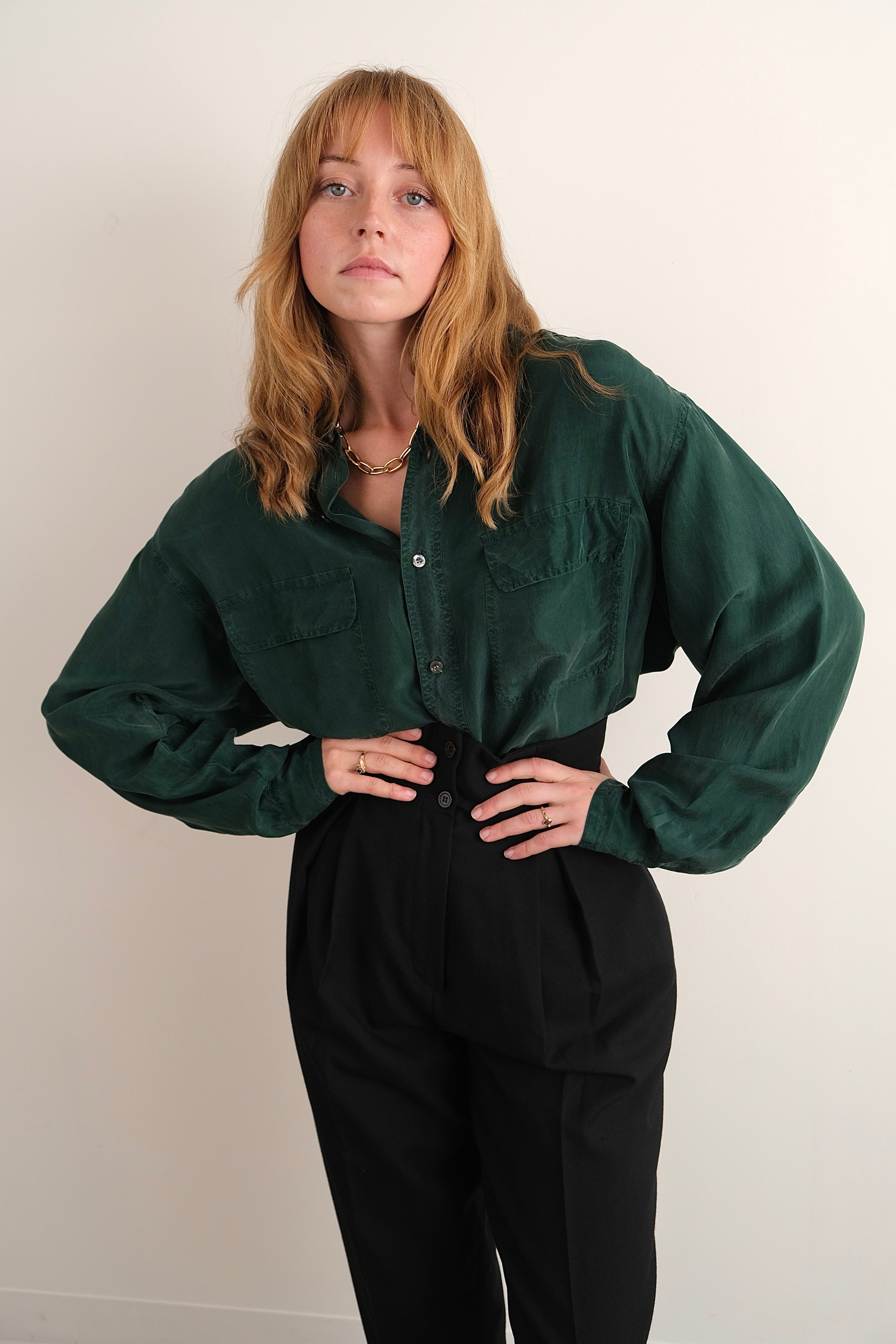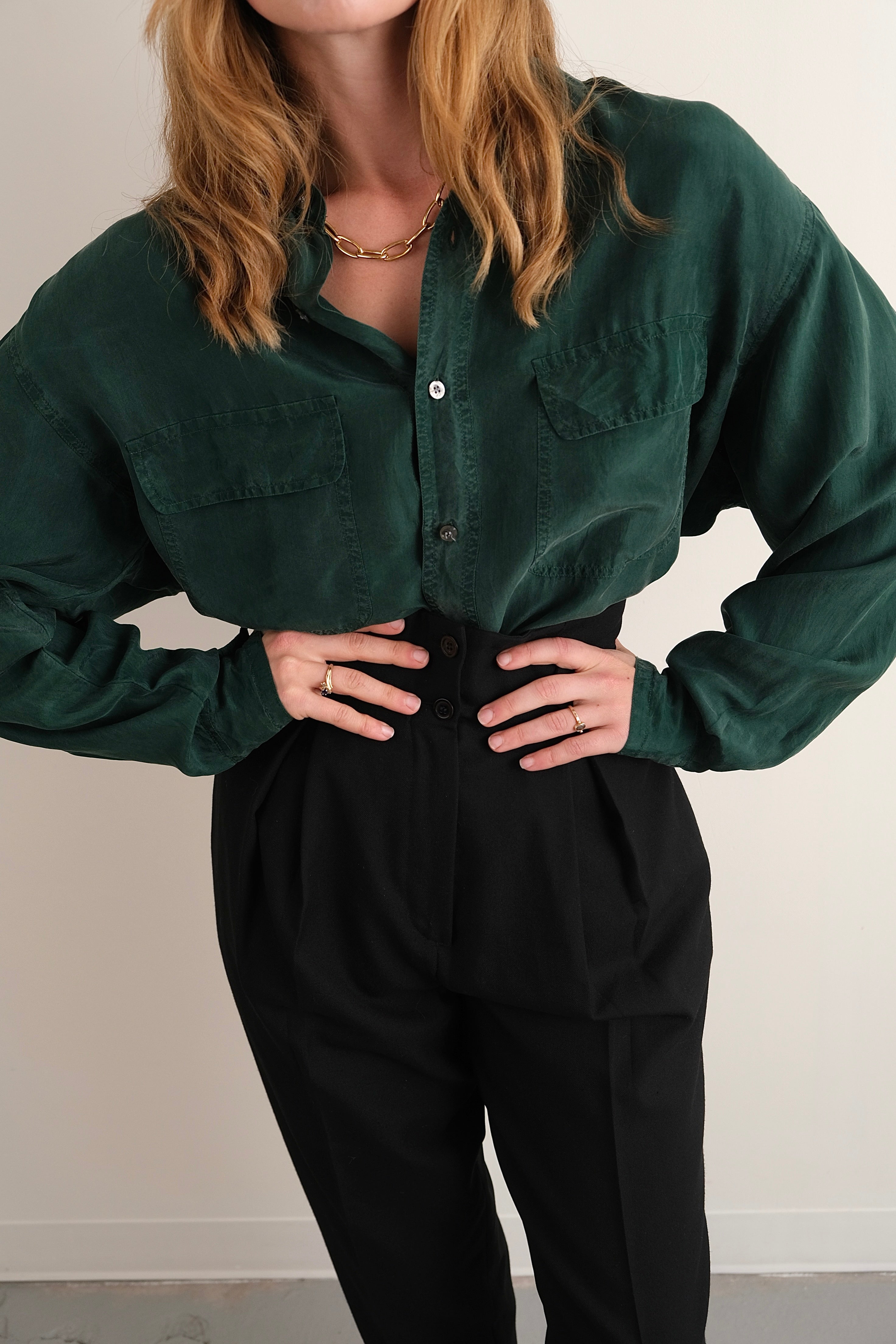 In deep green silk, this shirt has a softly textured surface and fluid drape characteristic of washed silk. Designed with a relaxed frame and slightly dropped shoulders, it features a pointed collar, button front, curved shirttail hem, and dual chest pockets with buttoned flaps. The fabric carries gentle tonal variation that enhances its natural luster and vintage ease.
