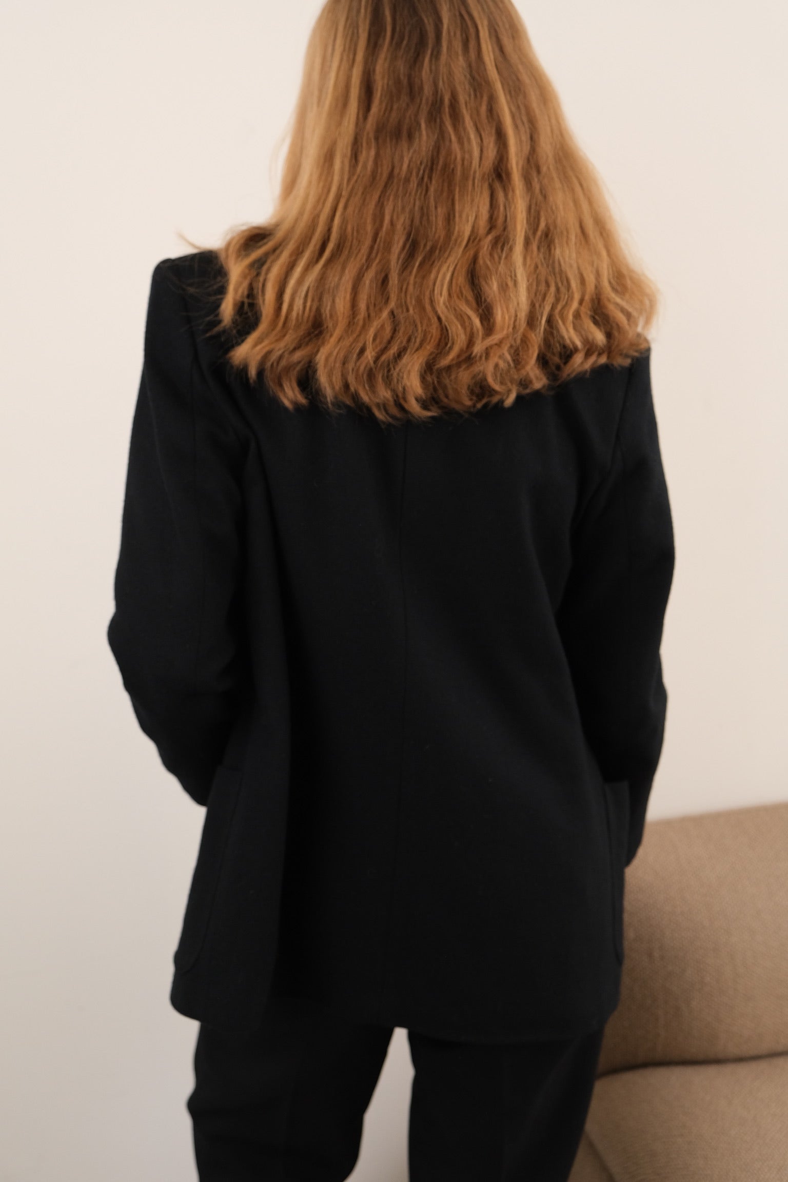 In black wool, this blazer has a smooth, lightly structured feel with a clean tailored drape through the body. Finished with notched lapels, a single-breasted front, and full lining, it offers a polished silhouette with comfortable structure.