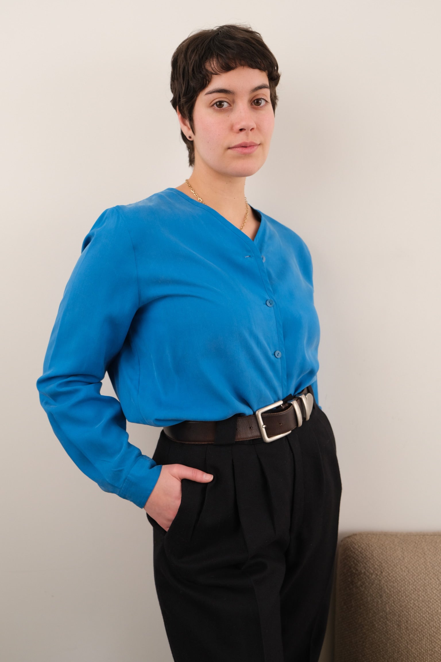 In vivid blue silk, this blouse feels smooth and fluid with a beautiful, light-catching finish. Cut with a clean v-neckline, button front, and lightly structured shoulders, it drapes easily through the body for a refined, effortless shape.