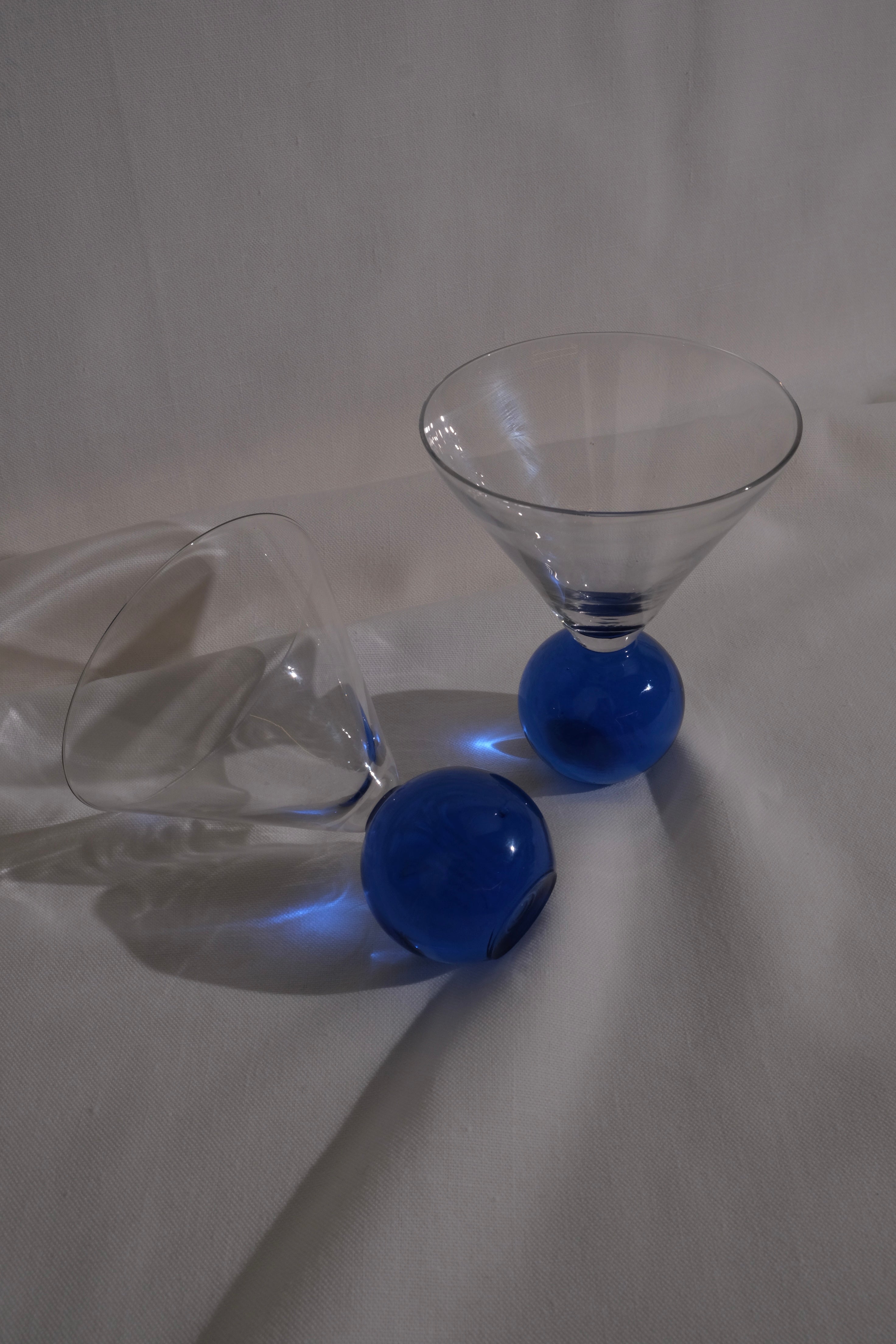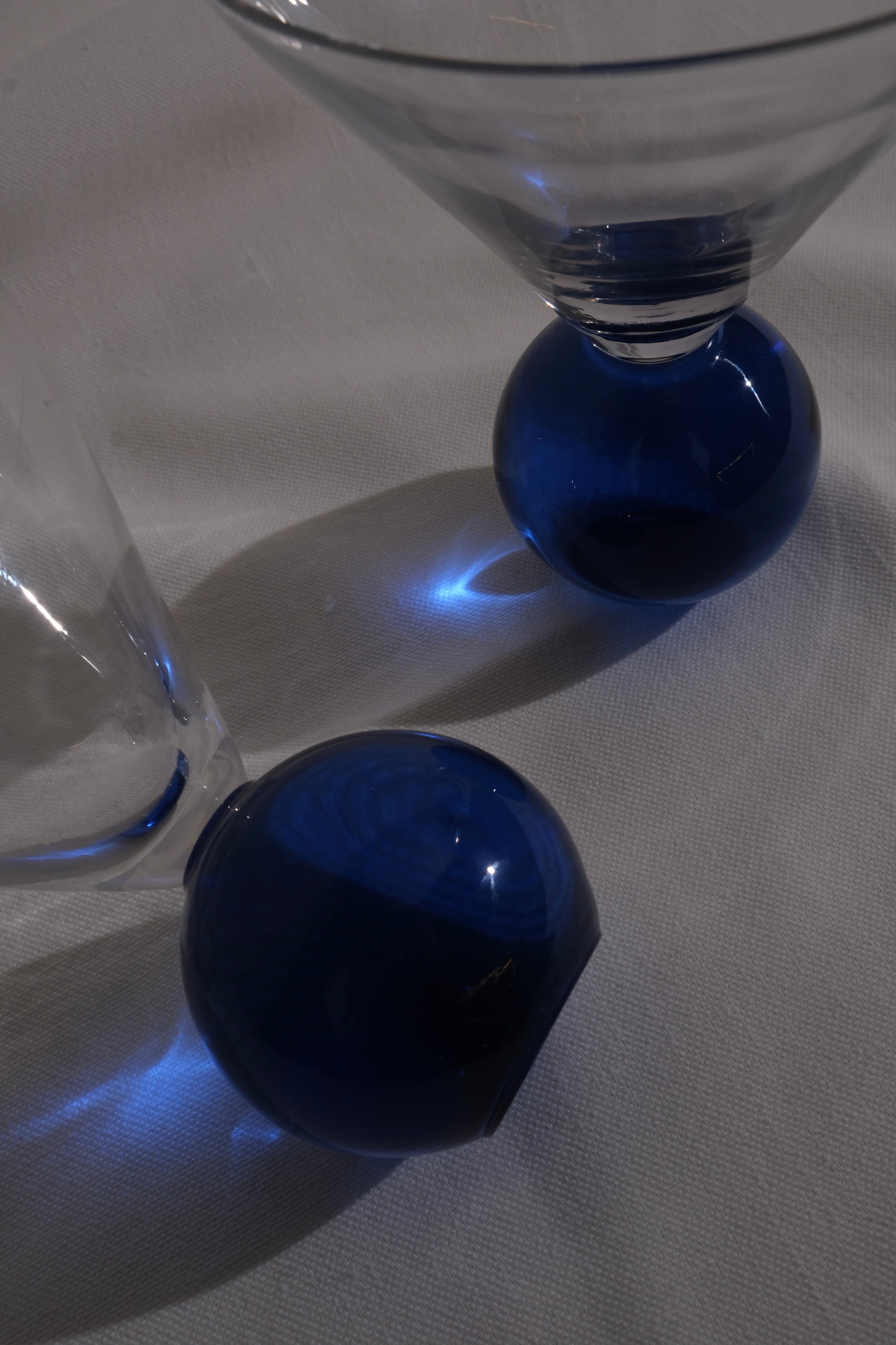 In clear and bright blue glass, these martini glasses have a striking, sculptural feel. Each features a sharply flared cone bowl fused into a solid cobalt blue sphere base.