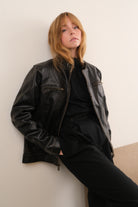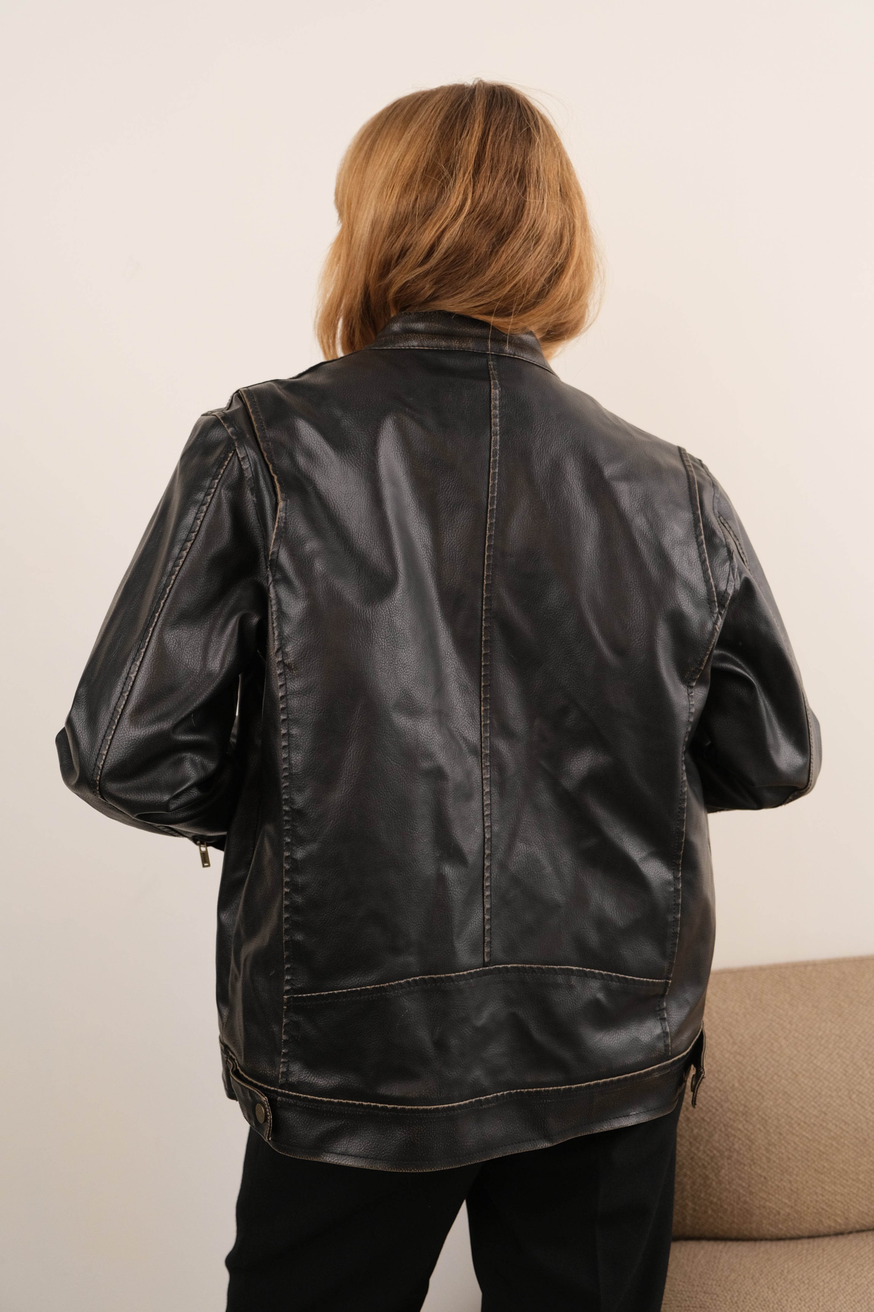 In dark brown faux leather with a structured yet pliable feel, this jacket has a warm polyester sherpa lining that adds texture and insulation throughout. It features a snap-tab collar, a full zip front, and four zippered pockets that sit cleanly along the surface for a streamlined look.