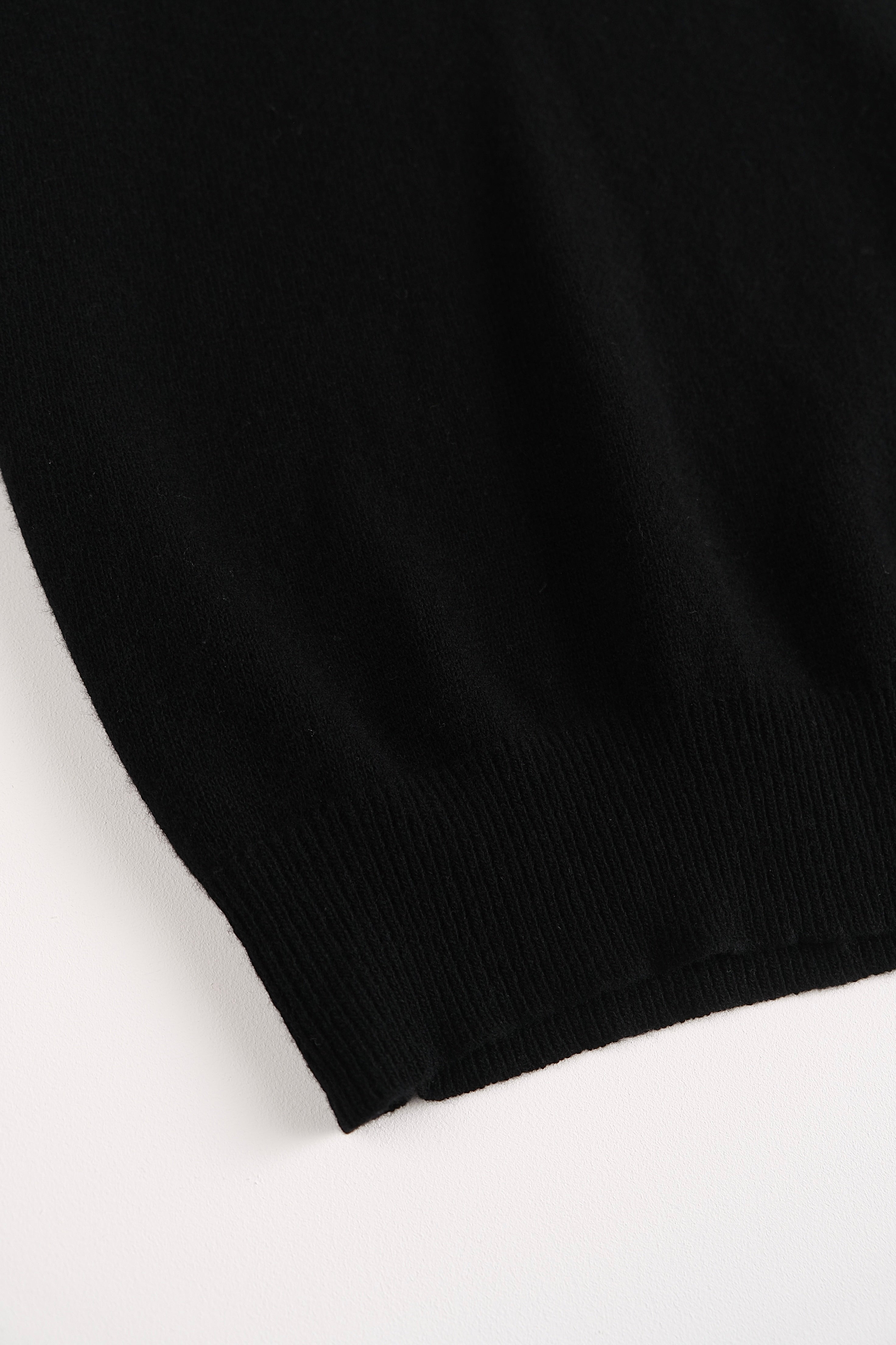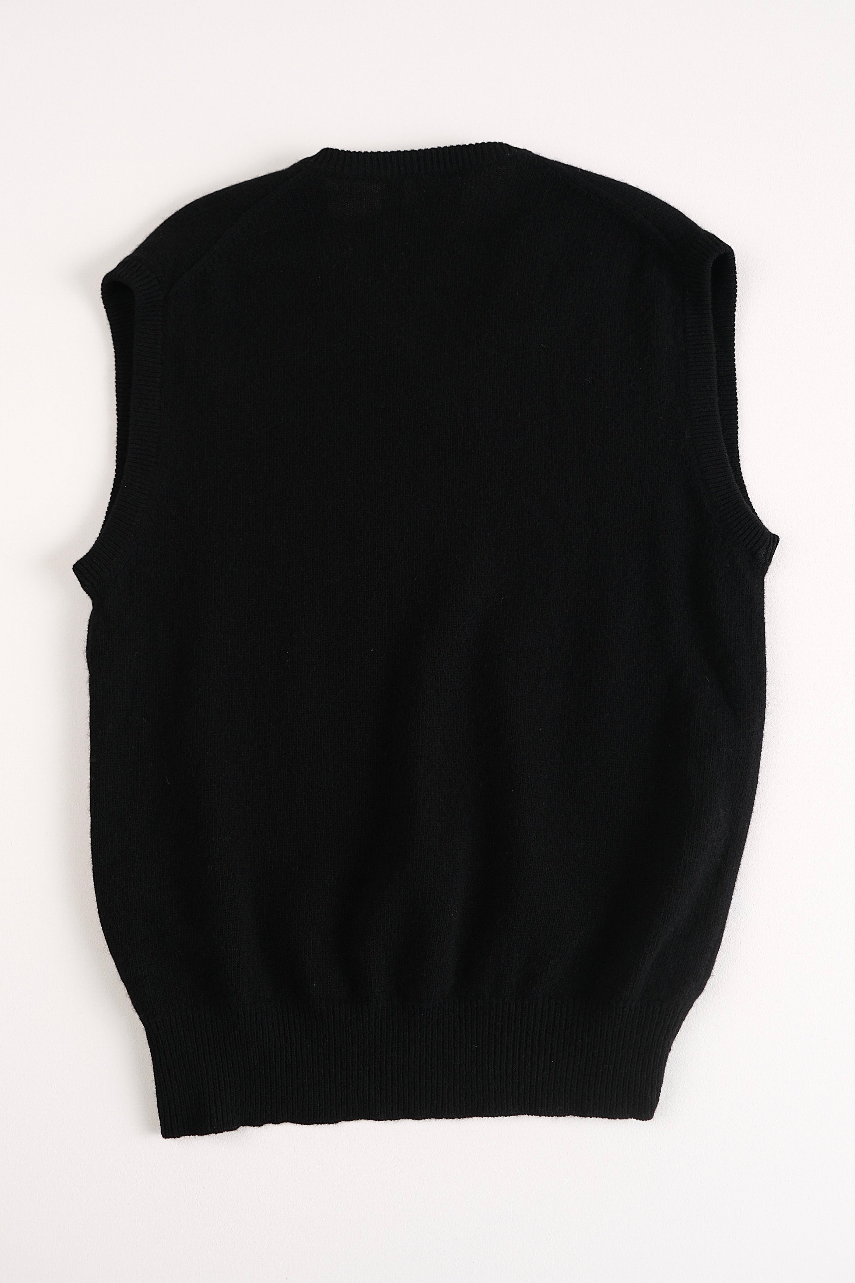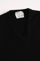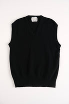 Rendered in true black 100% pure wool, this sleeveless sweater carries a soft yet weighty hand, characteristic of mid-century Scottish knitwear. The V-neckline and ribbed trims at the arms and hem lend quiet structure to its naturally draping form. Designed by Deans of Scotland for The Nassau Shop of the Bahamas, it exemplifies cross-Atlantic craftsmanship from a boutique heritage maker known for quality woolens. The knit remains supple with no visible pilling or flaws, suggesting careful preservation over time.