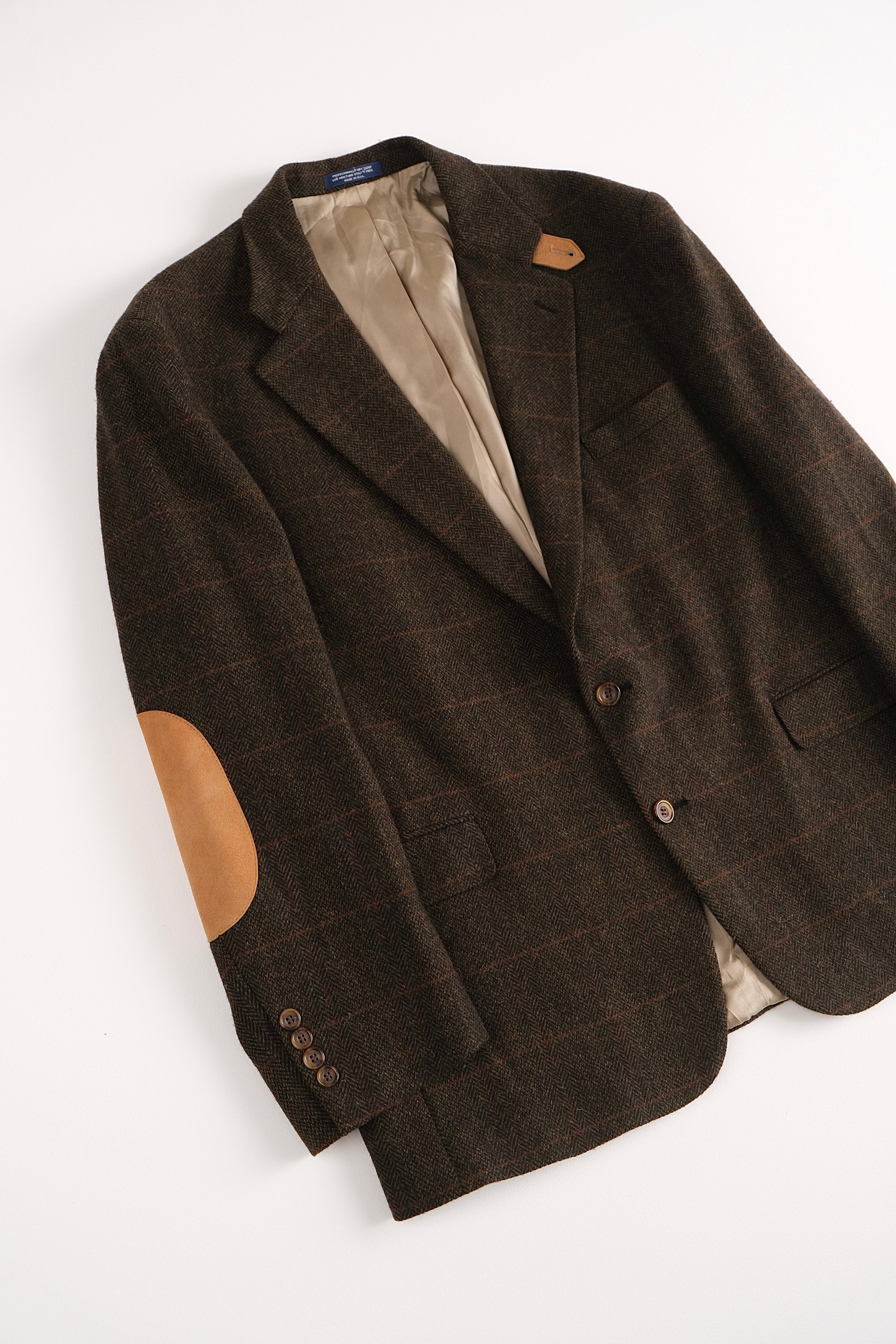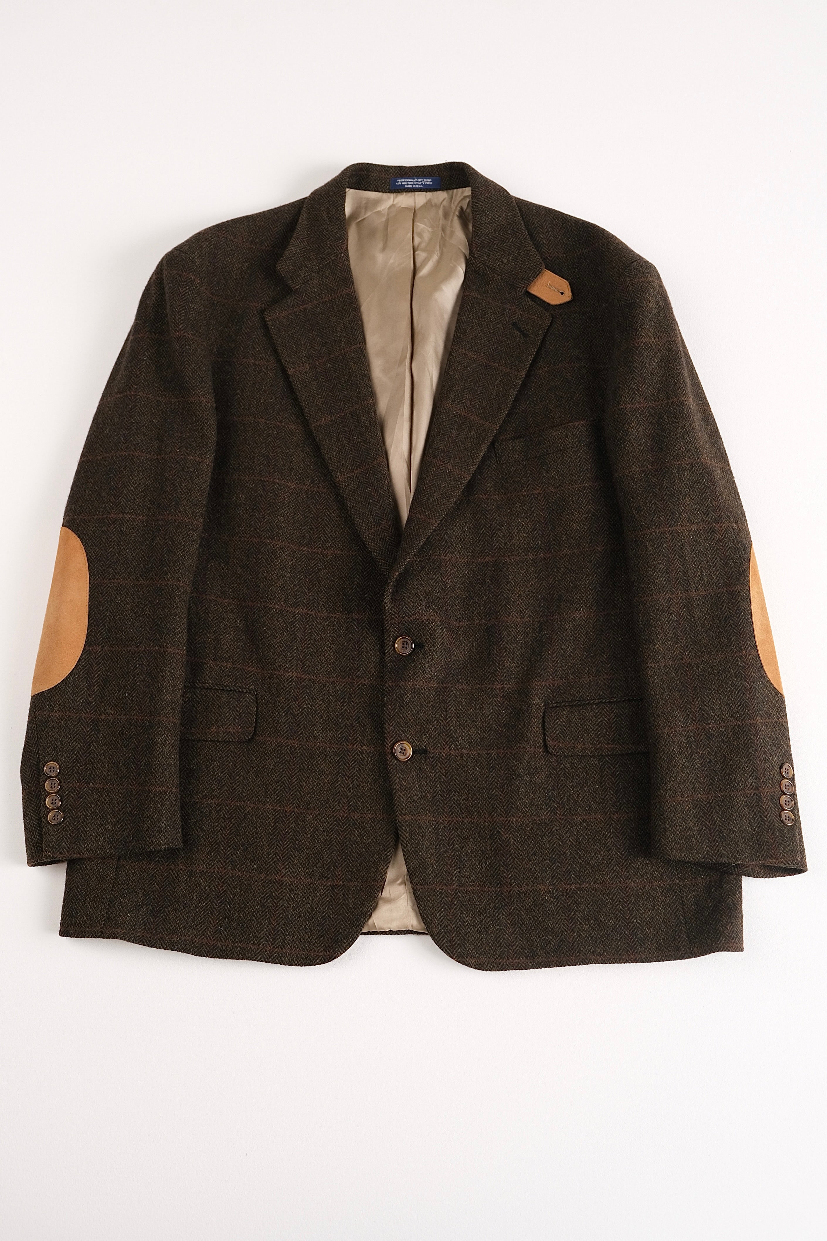 Crafted from deeply toned chestnut brown pure wool, this herringbone blazer captures the quiet sophistication of 1970s American tailoring. The weave features a subtle golden overcheck that adds warmth and depth to the tweed pattern, while the silhouette maintains classic proportions with soft shoulders and a structured drape. Camel suede elbow patches lend a field-inspired touch, balancing refinement with wearability. Fully lined in smooth taupe satin, with a two-button front, notch lapel, and flap pockets, this piece reflects the enduring utility and character of mid-century sportswear tailoring.
