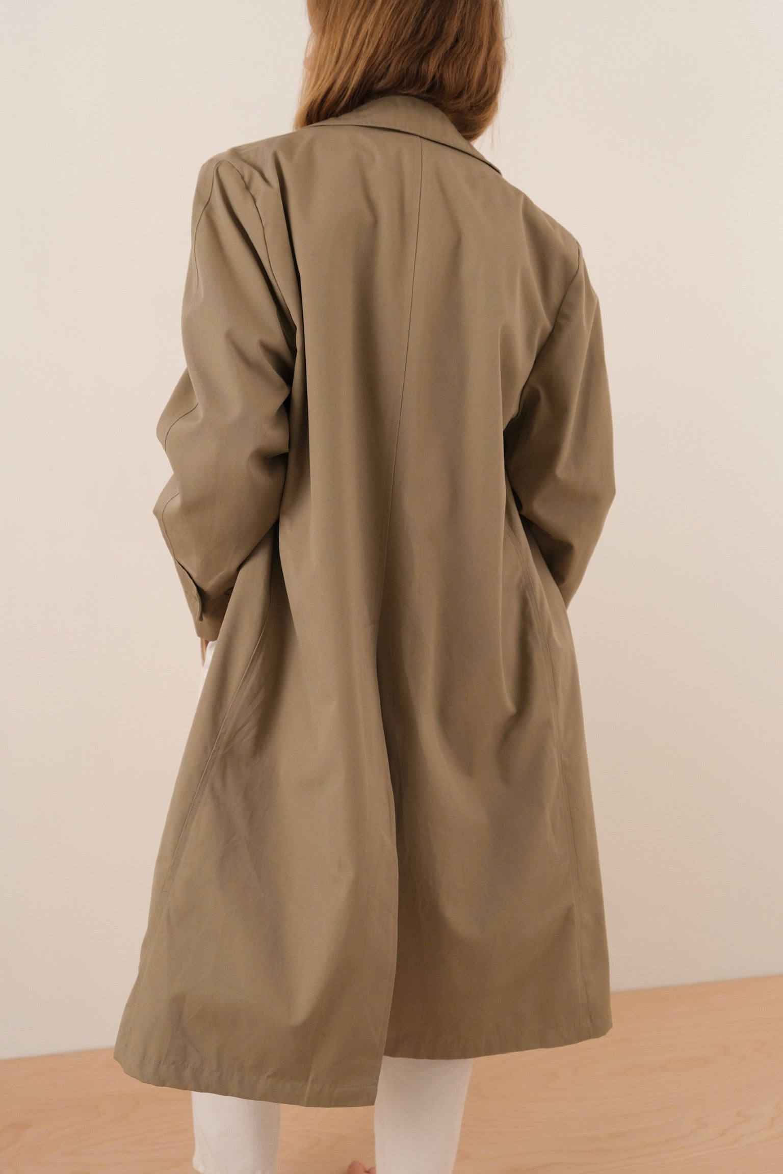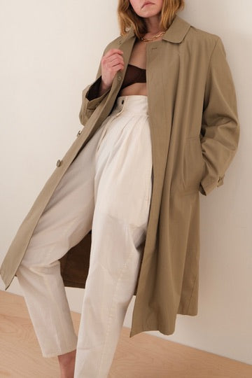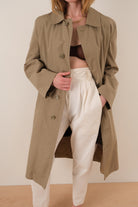 This tan cotton blend coat is cut in a relaxed full-length silhouette with a clean point collar and front button closure. It features a smooth, lightly structured shell with set-in sleeves, side pockets, and a removable interior liner for added versatility. The shape falls straight through the body with a soft drape that holds its form without stiffness.