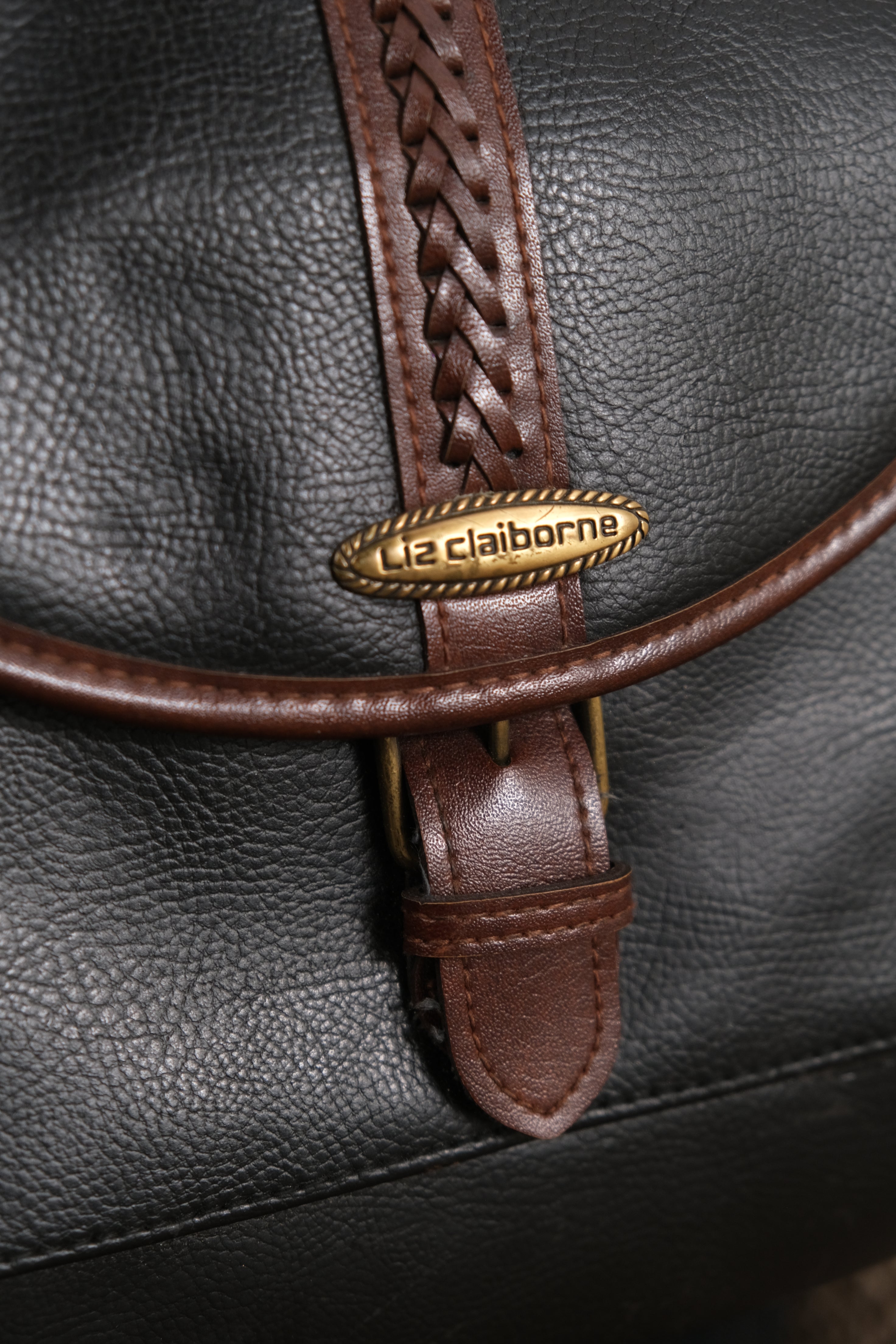 Composed of black pebbled leather with chocolate brown trim, this crossbody bag balances structure with softness. A woven leather accent runs along the flap, complemented by brass hardware and a front magnetic buckle closure. Inside, a fabric-lined compartment with a secure zip pocket offers functional organization for daily use. The adjustable strap allows for shoulder or crossbody wear. Light surface wear to the edges and corners is consistent with gentle vintage use.