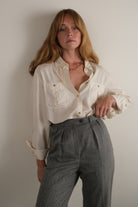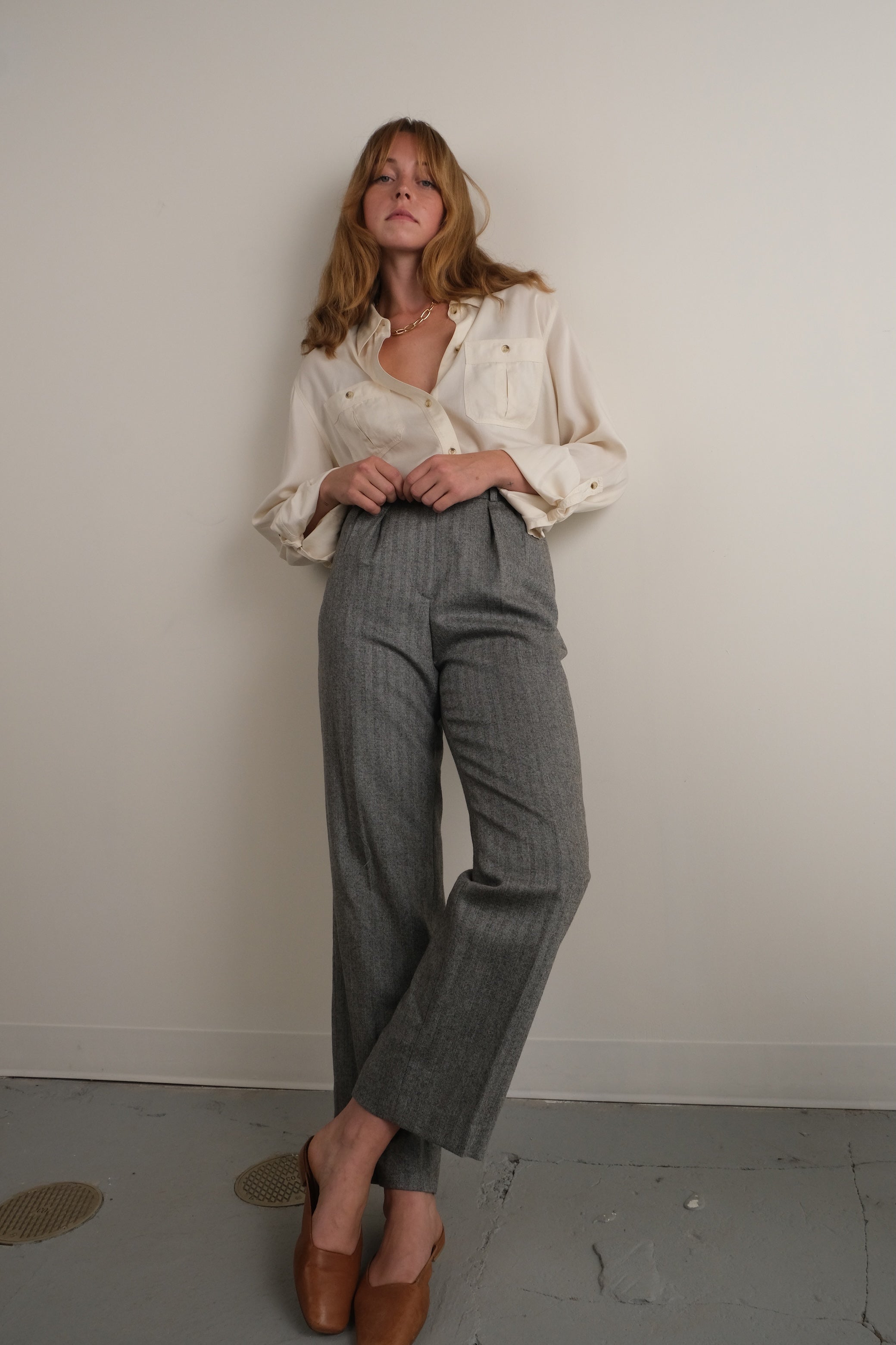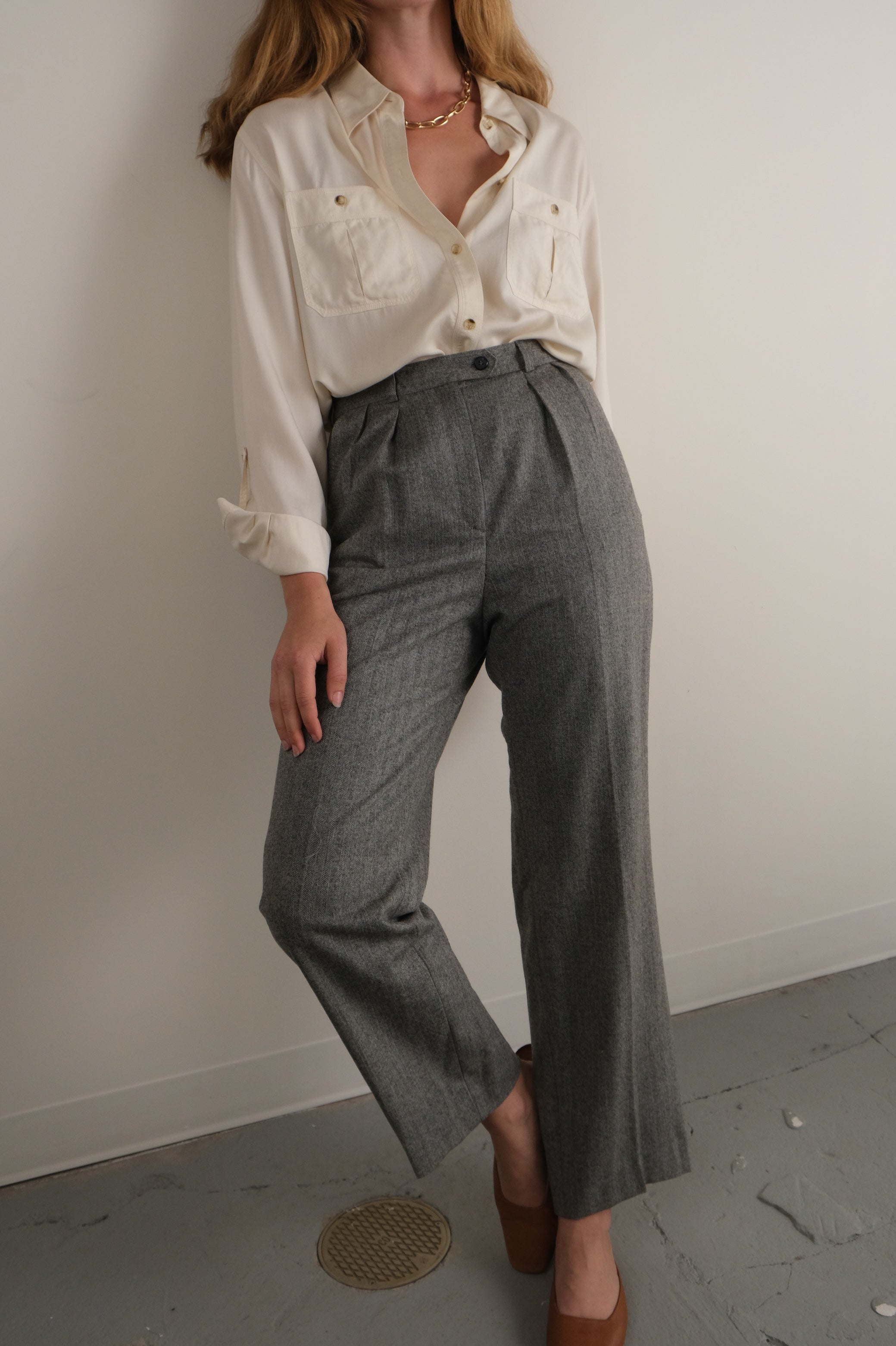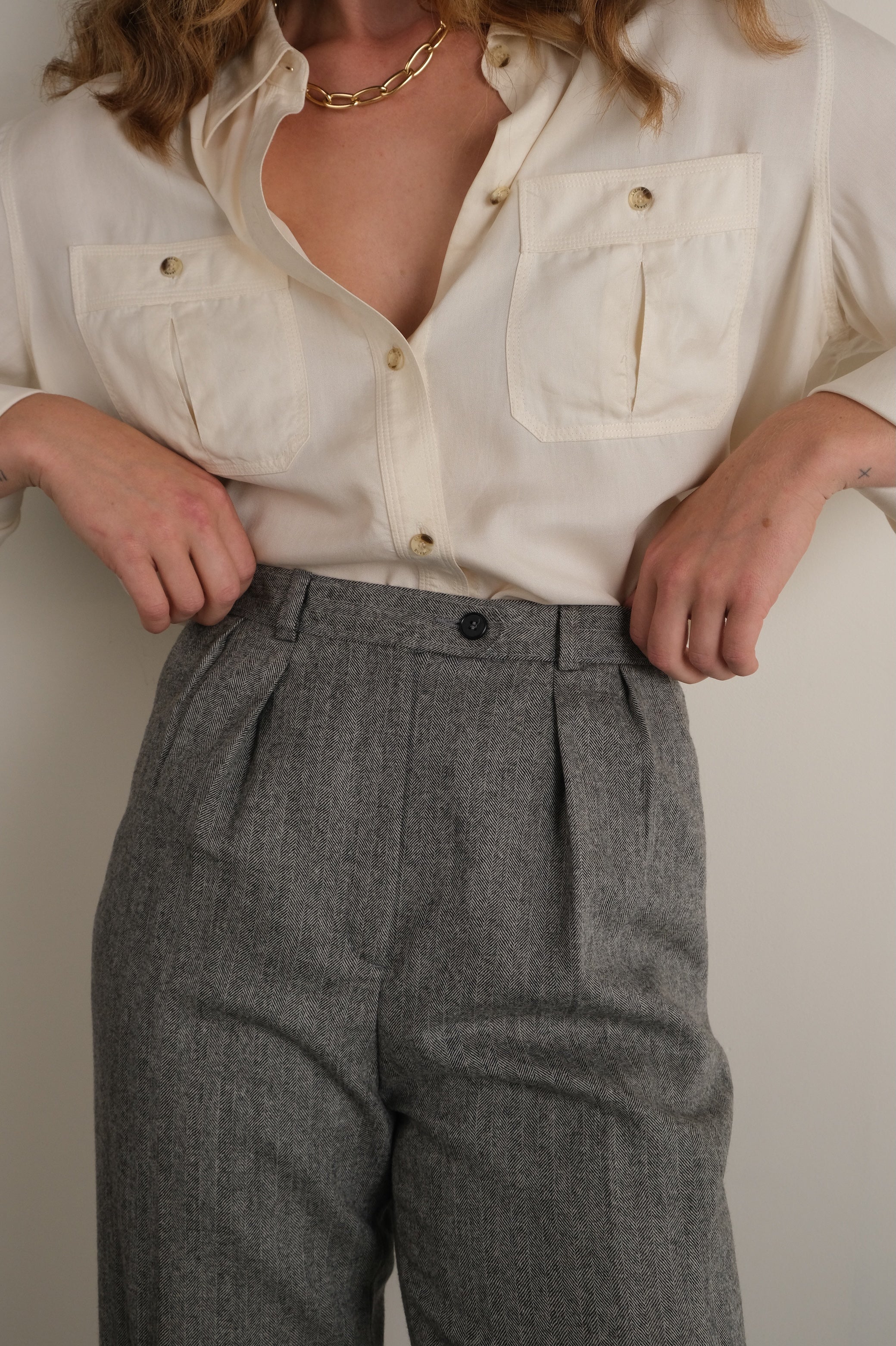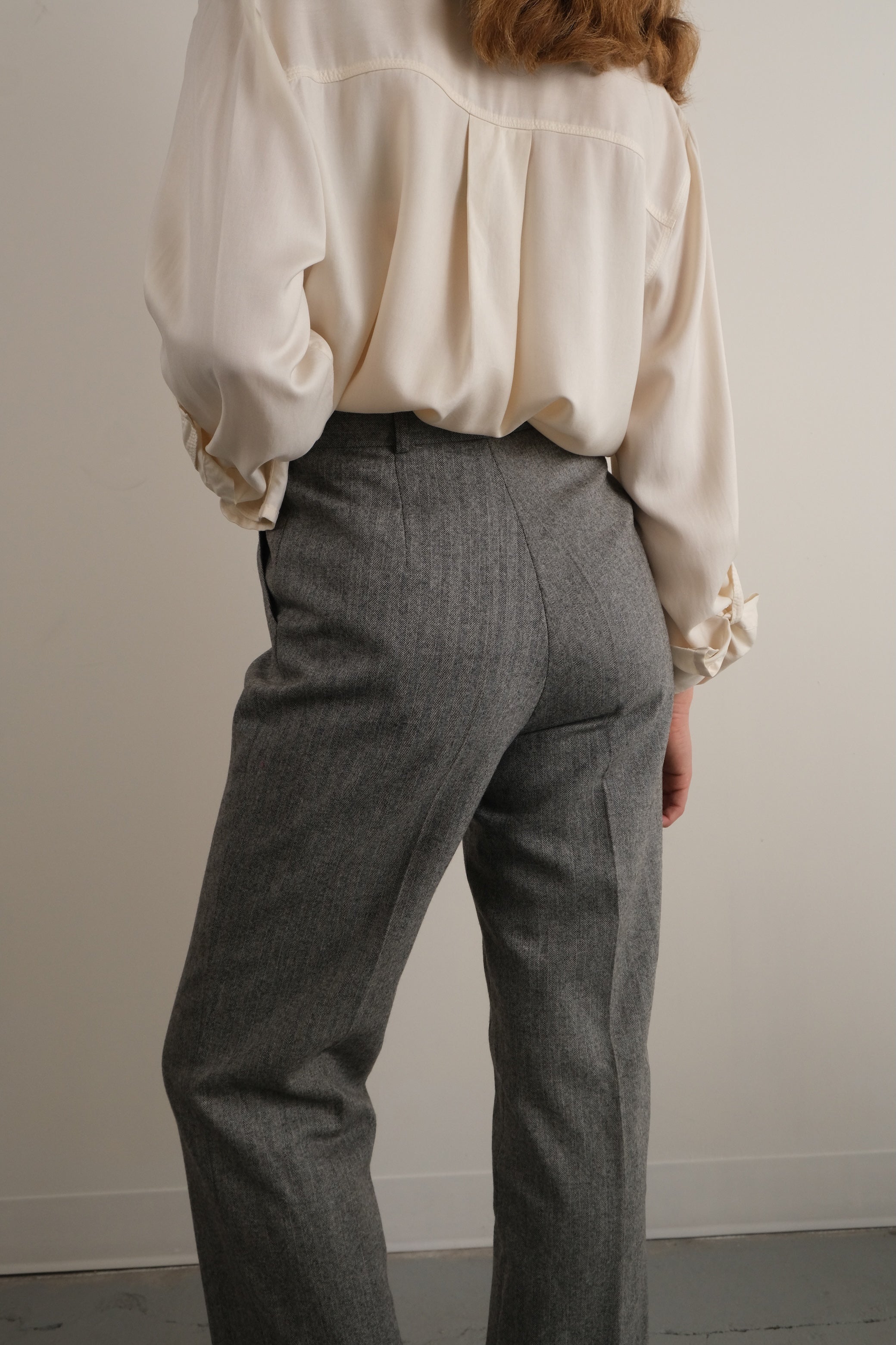 Vintage 80s Stone Merino Wool Herringbone Trousers