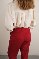 Rendered in vivid red pure wool, these trousers carry a structured, weighty feel with a smooth finish. Cut with a high rise and double front pleats, they fall into a straight leg that tapers gently toward the cuffed hem. Side slant pockets and a button-fastened waistband complete the design, balancing tailoring with ease.