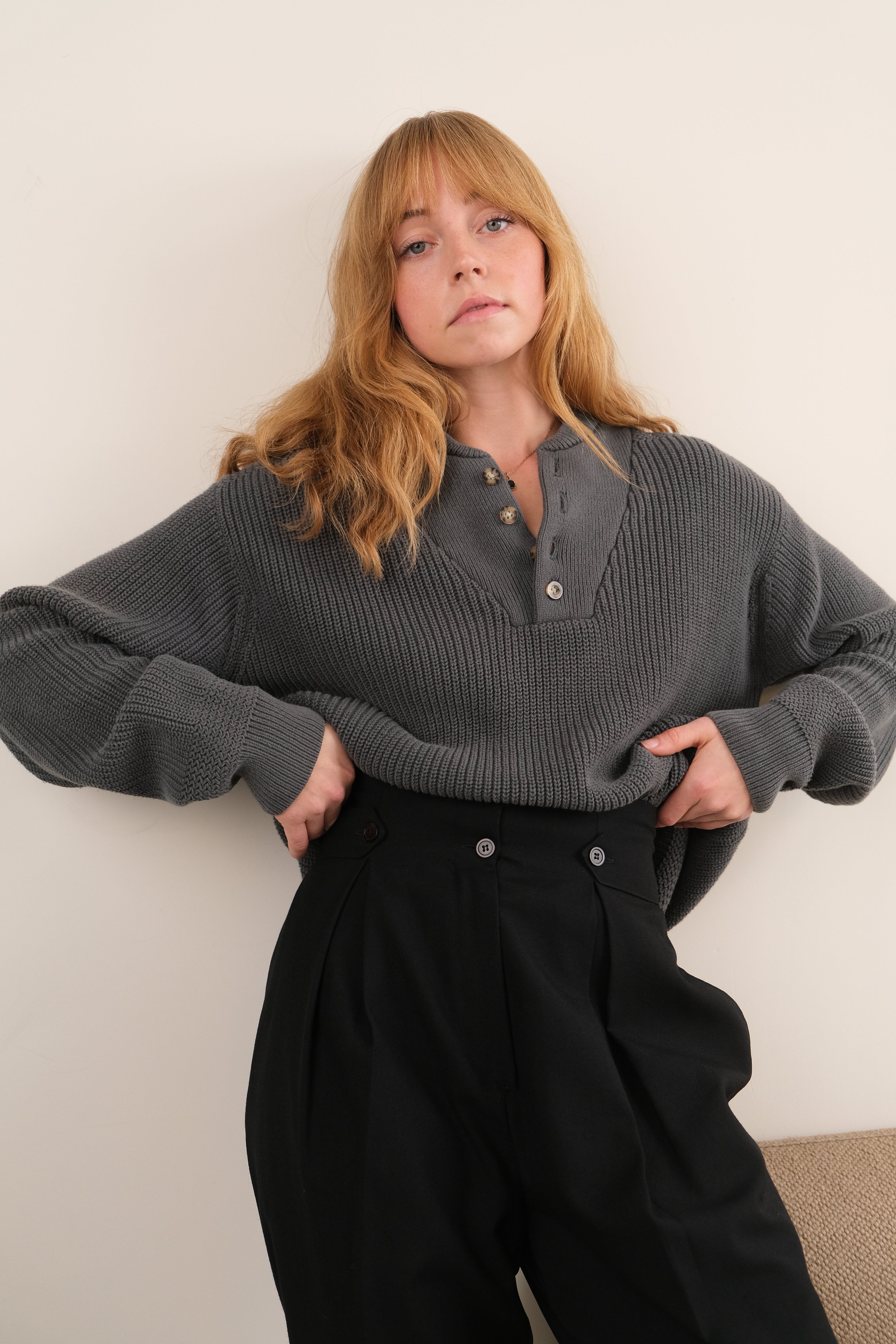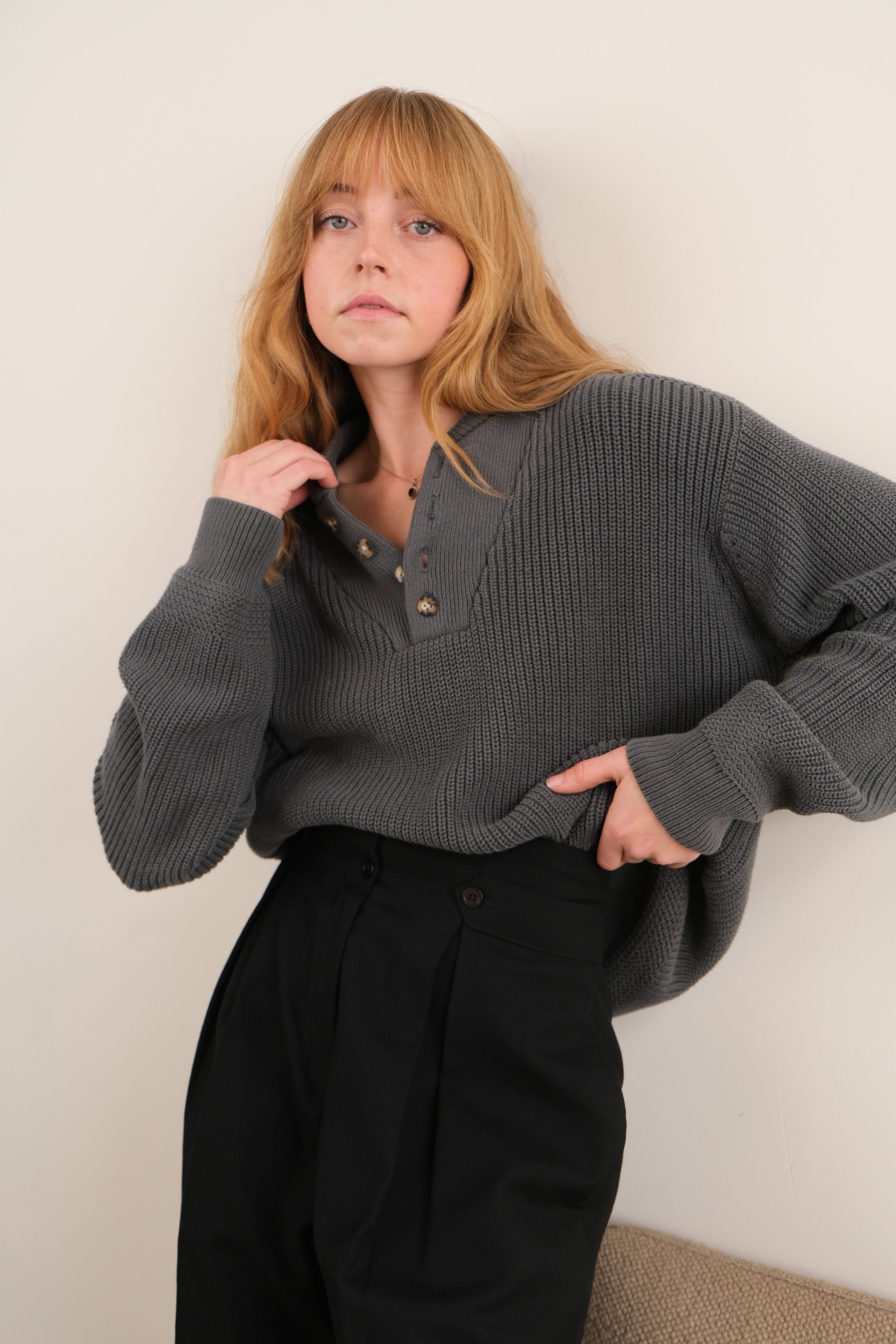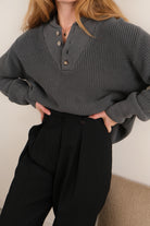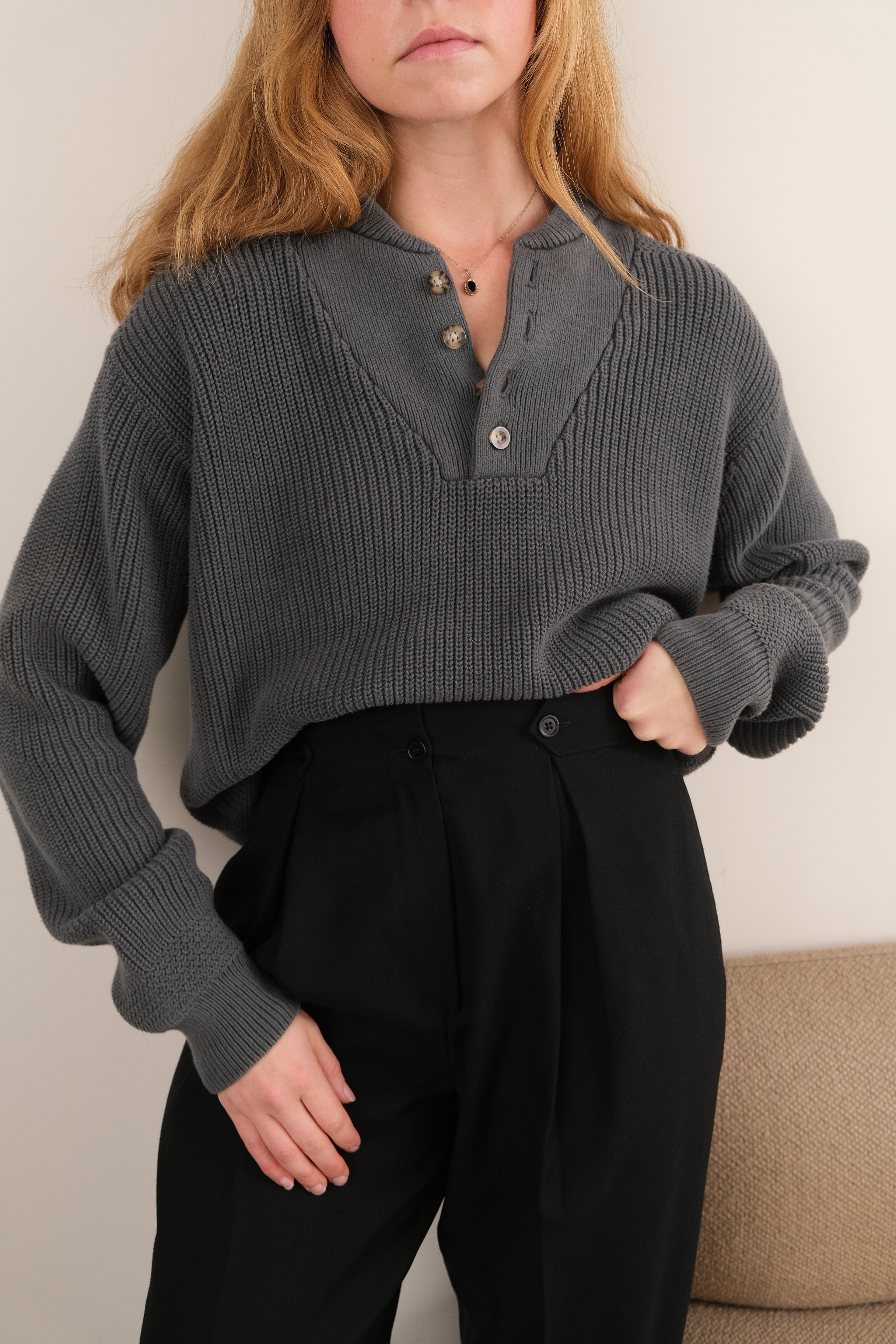 In gorgeous warm greenish gray cotton knit, this sweater has a midweight, durable texture with a soft interior feel. Designed with a ribbed neckline and cuffs, it features a four-button henley placket with marbled tortoise buttons and a slightly relaxed frame that sits comfortably at the waist.
