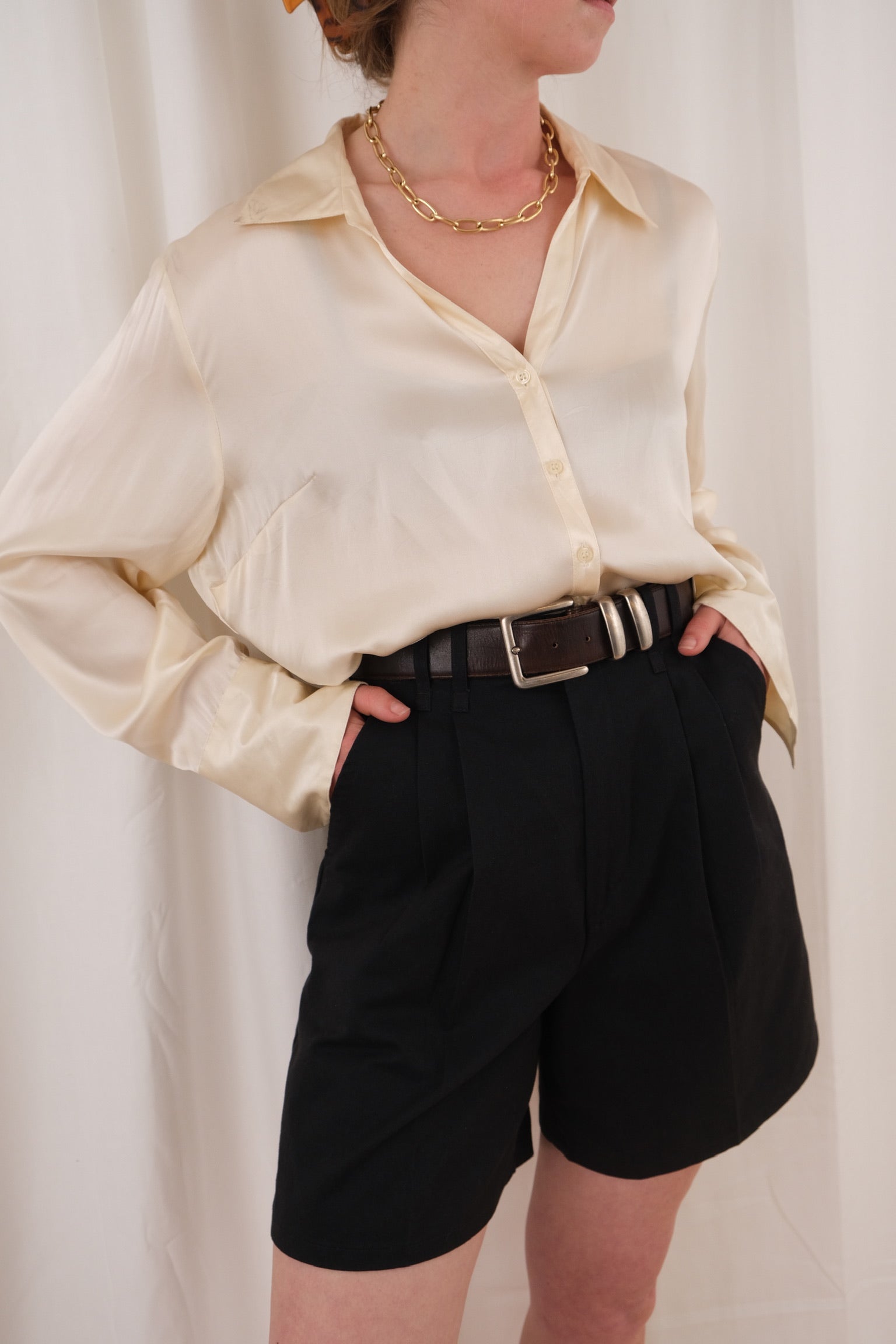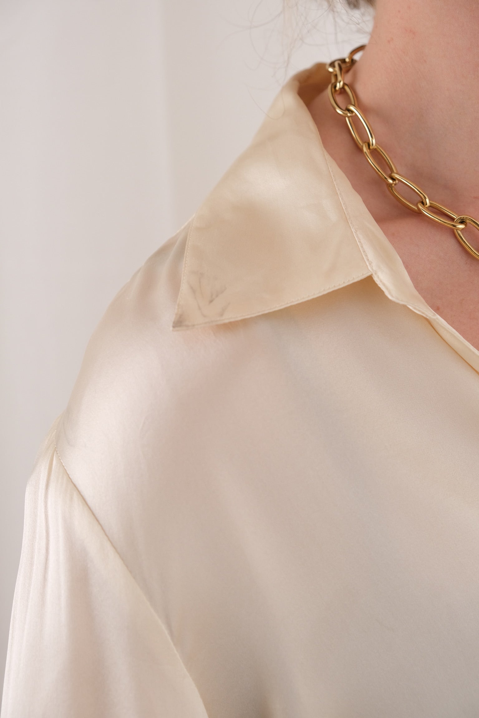 Cream 100% silk blouse with a fluid drape and relaxed silhouette. Features a pointed collar, front button closure, and extended cuffs with a smooth, lightweight finish.