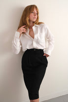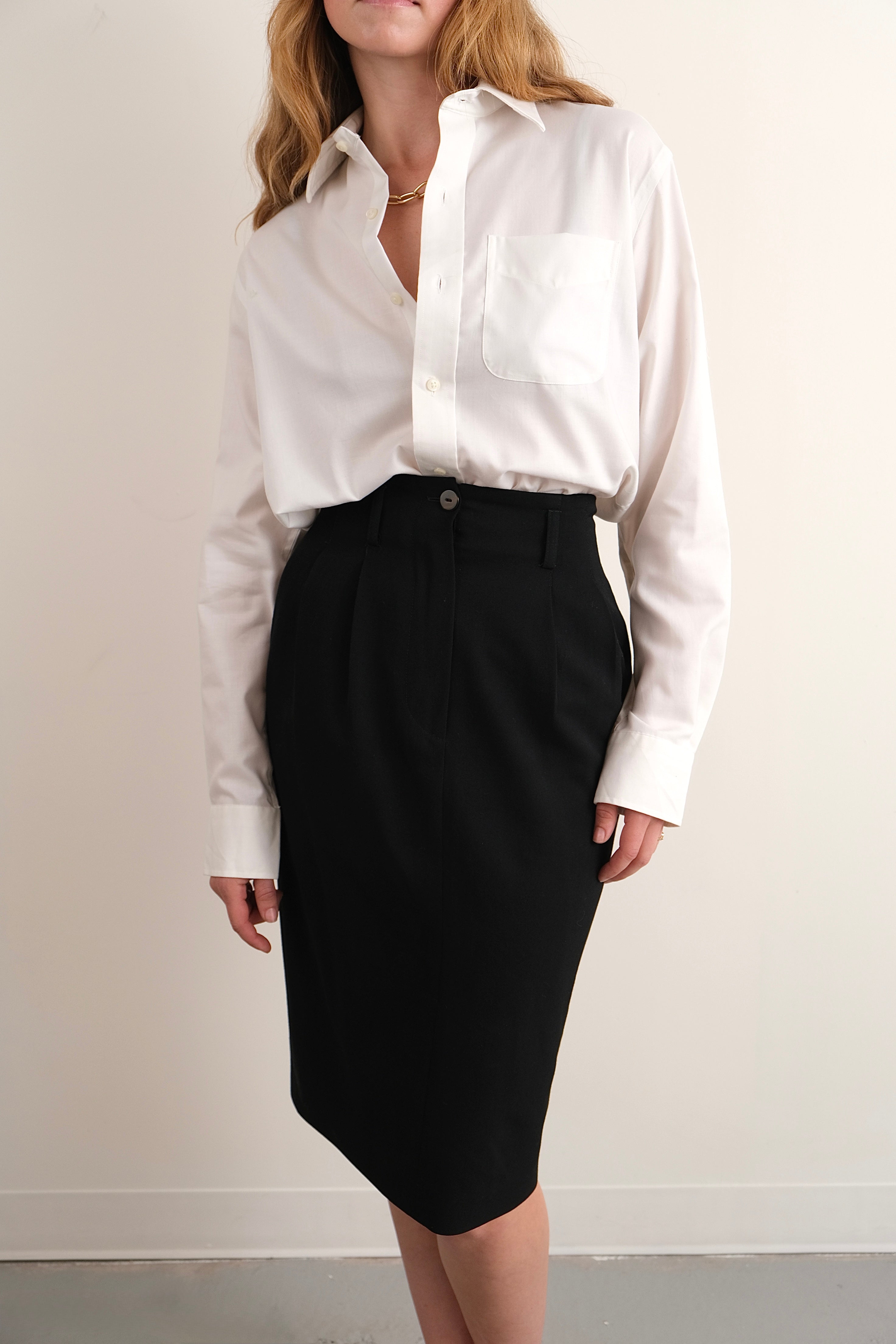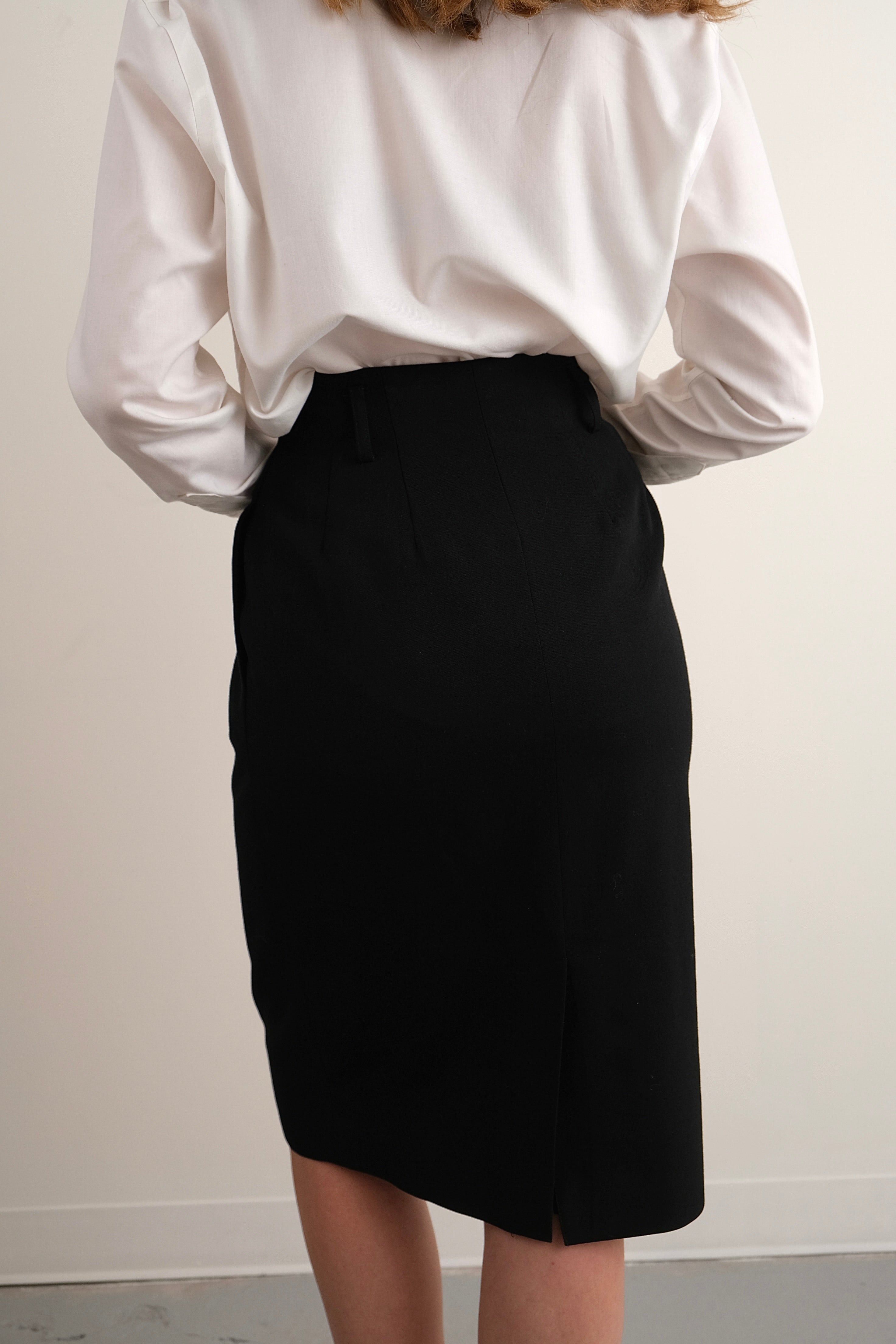 Woven in pure black wool, this skirt carries a smooth yet substantial drape that holds its shape beautifully. The front pleats introduce gentle volume through the hips, while the straight cut tapers slightly for an elongating effect. A single horn-style button and zip closure complete the waistline, reinforcing its clean, tailored finish.