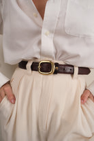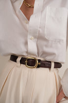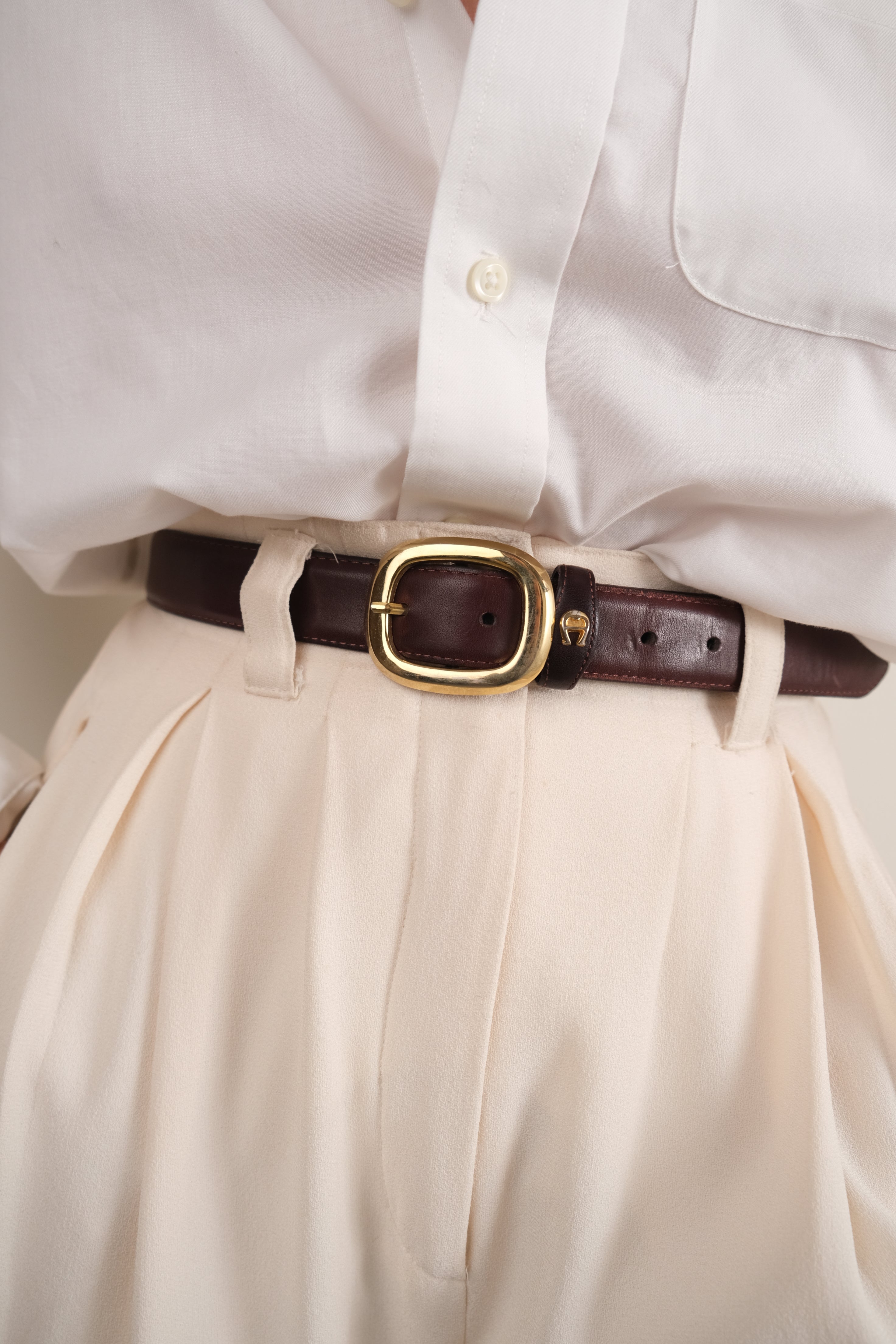 Cut from smooth chestnut brown leather, this belt offers a supple feel and polished finish. The solid brass buckle bears Étienne Aigner’s signature horseshoe emblem, subtly embossed along the inner curve. Its refined construction is complemented by tonal stitching and a tapered tip, balancing utilitarian structure with understated elegance.
