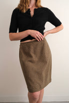 In brown and black houndstooth wool blend, this skirt offers a structured yet comfortable feel with a smooth inner lining. Designed in a clean, straight silhouette, it sits at the natural waist and finishes with a small front vent for ease of movement. The pattern’s subtle texture adds warmth and visual depth, making it an easy pairing piece for fall layering.