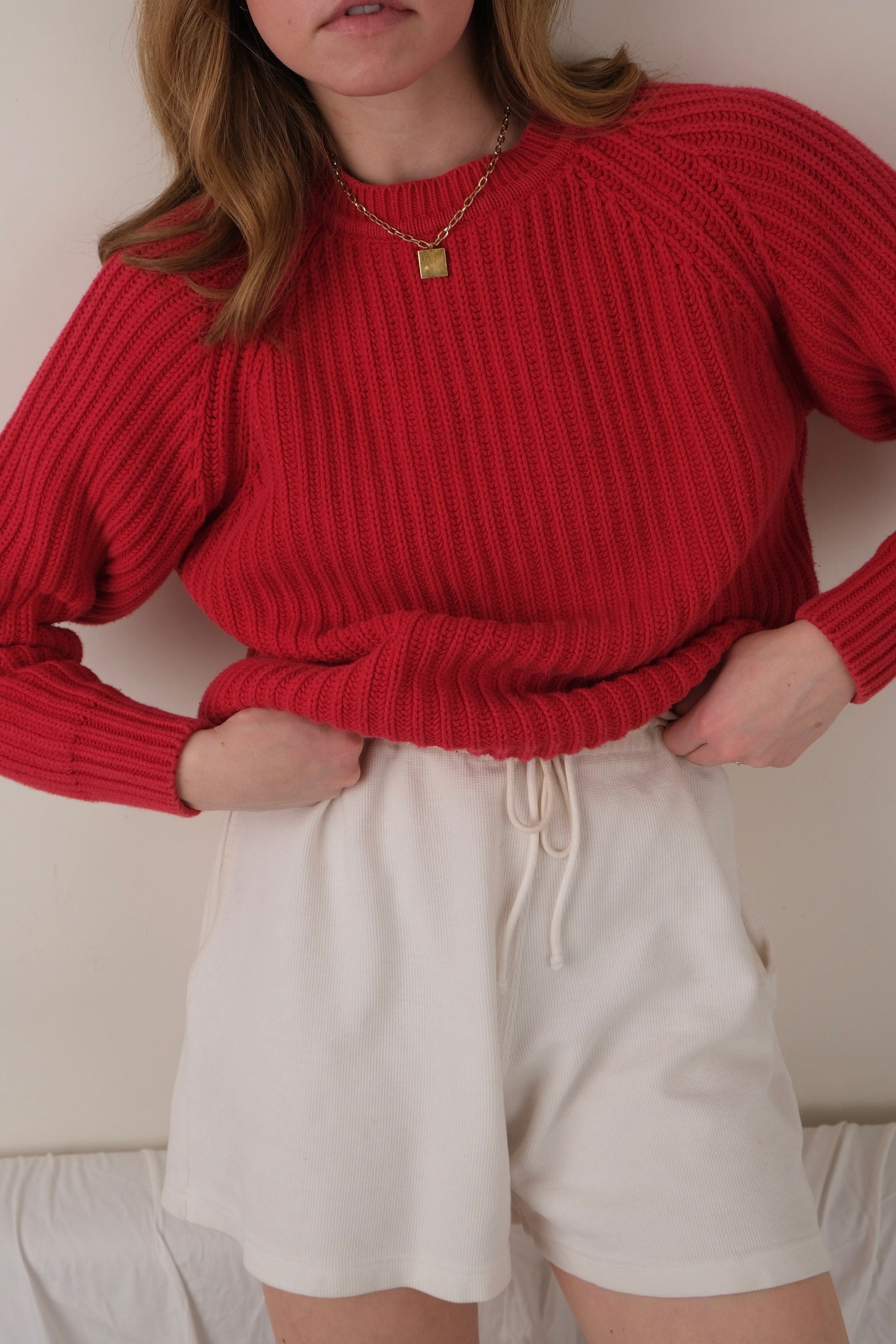$48–$68 A red cotton knit sweater from the 1990s with a ribbed texture and classic crewneck design.
