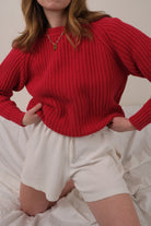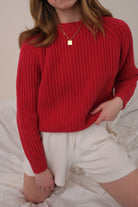 This red cotton knit sweater features a ribbed texture with a soft, medium-weight construction. Designed with a classic crew neckline and raglan sleeves, it presents a clean, slightly relaxed silhouette. The overall structure is simple and balanced, with a gently fitted hem and cuffs.