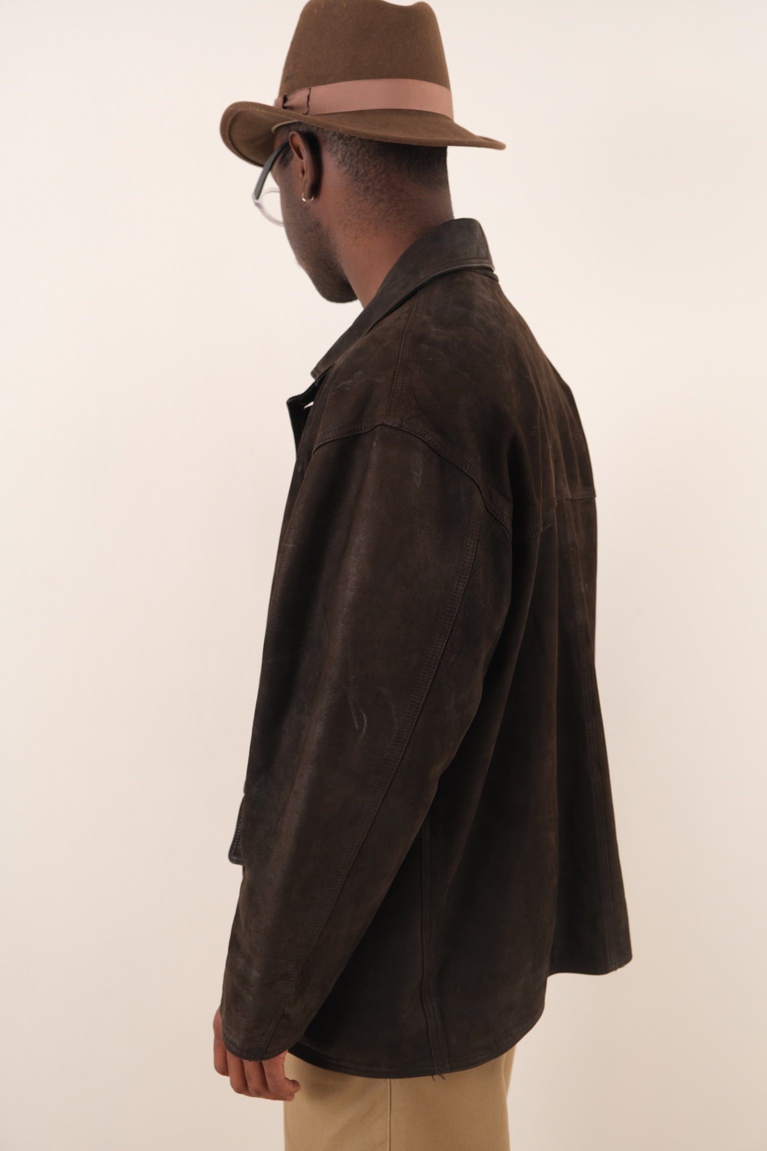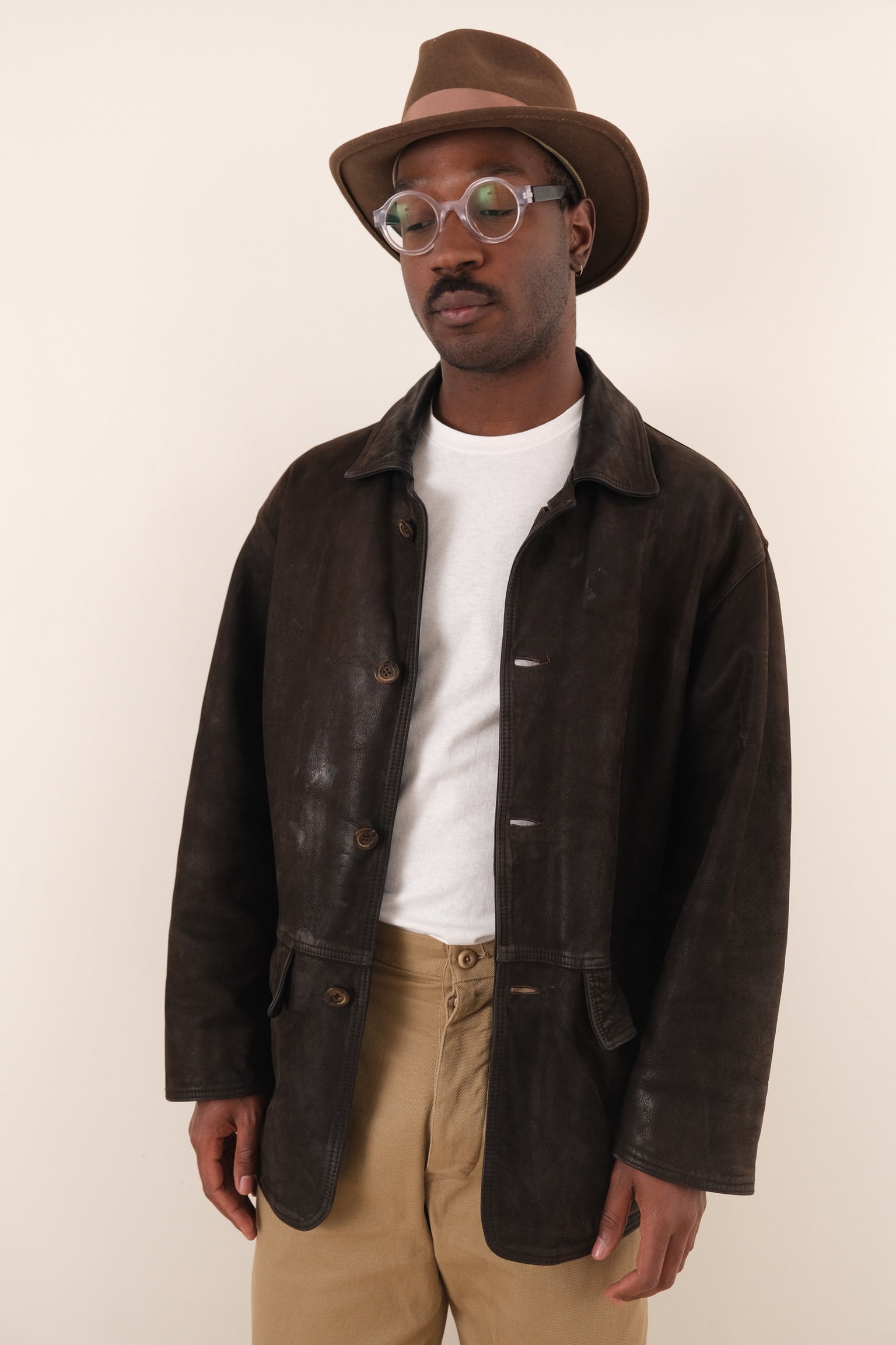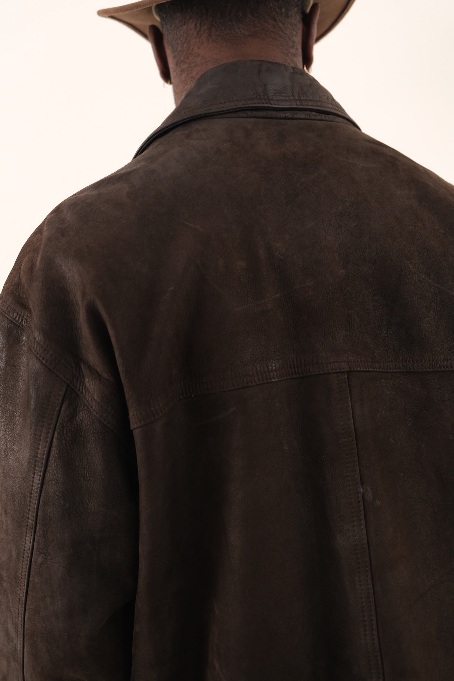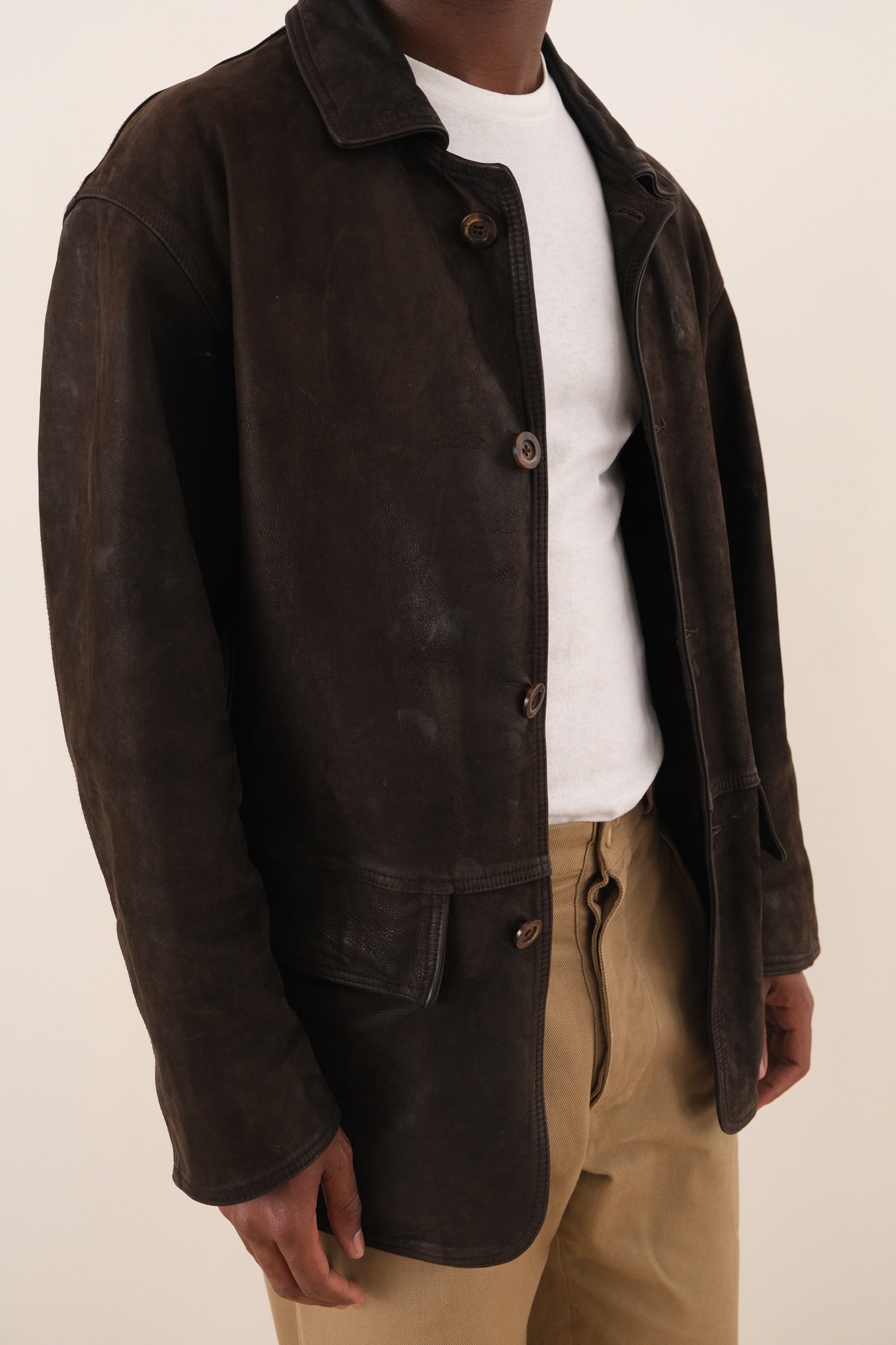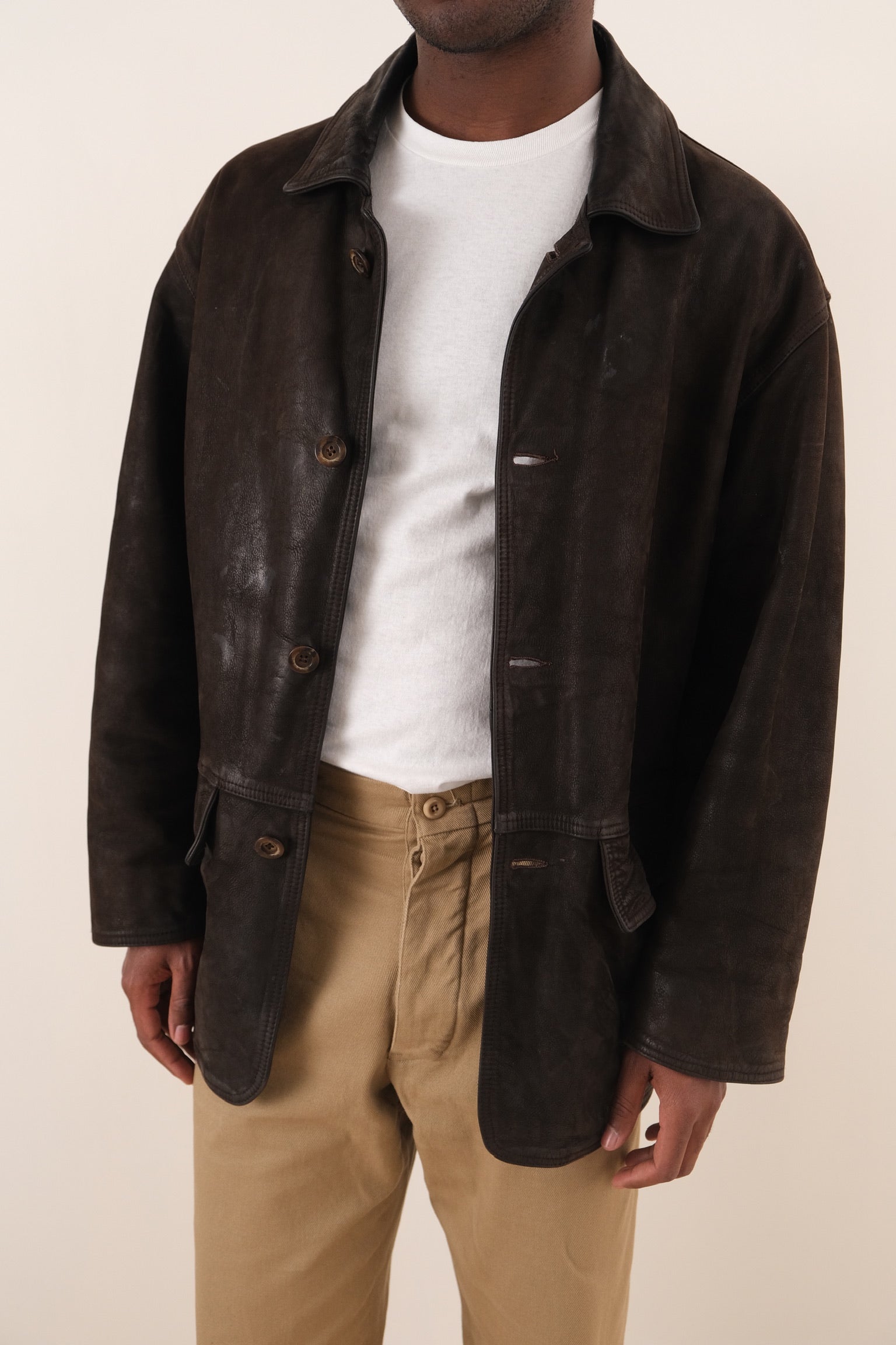 Dark brown leather jacket with a structured silhouette and a smooth, lightly worn surface that shows natural variation throughout. Designed with a pointed collar, button up front, and front patch pockets, giving it a clean and utilitarian construction. The leather shows visible patina that adds depth and character across the garment.