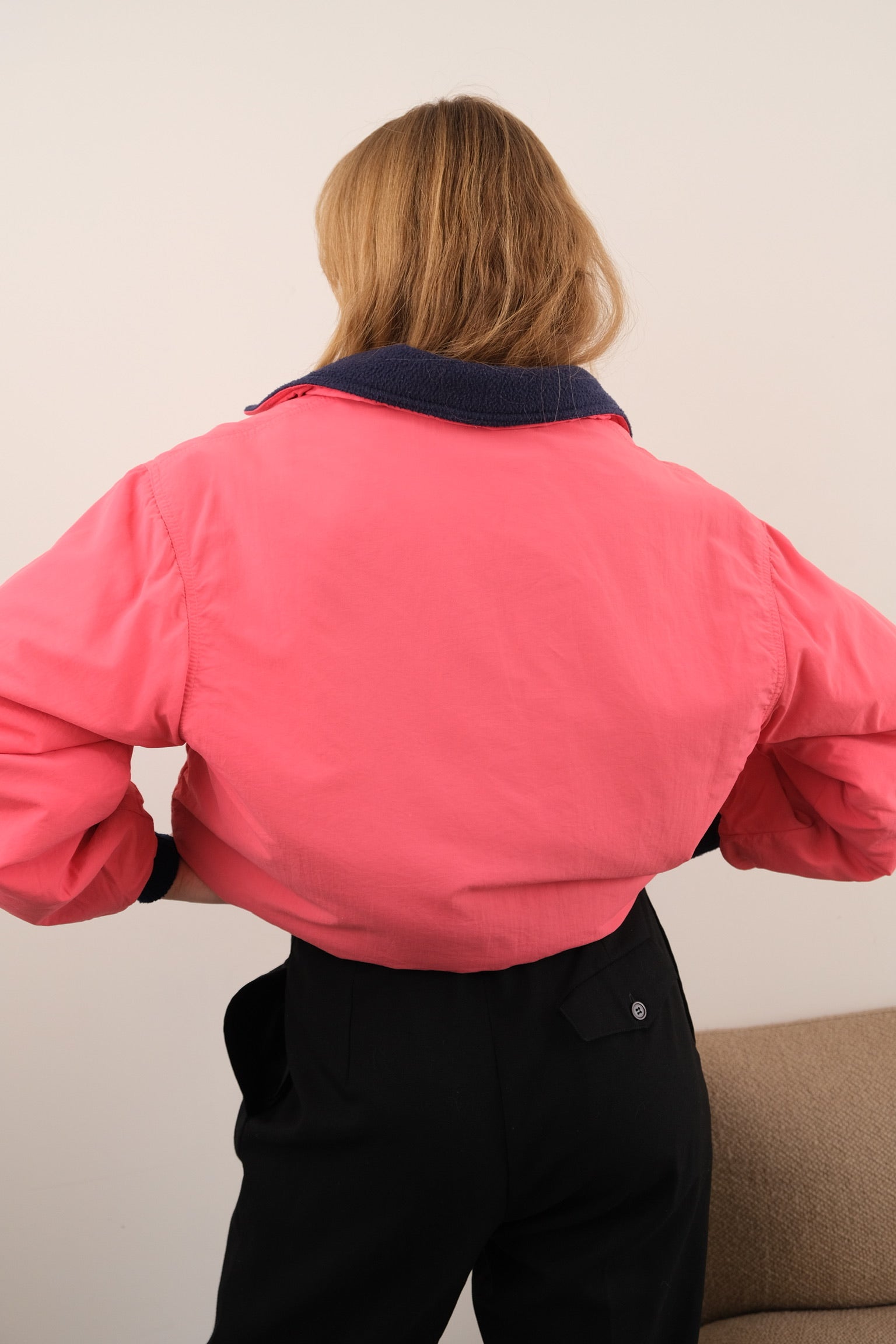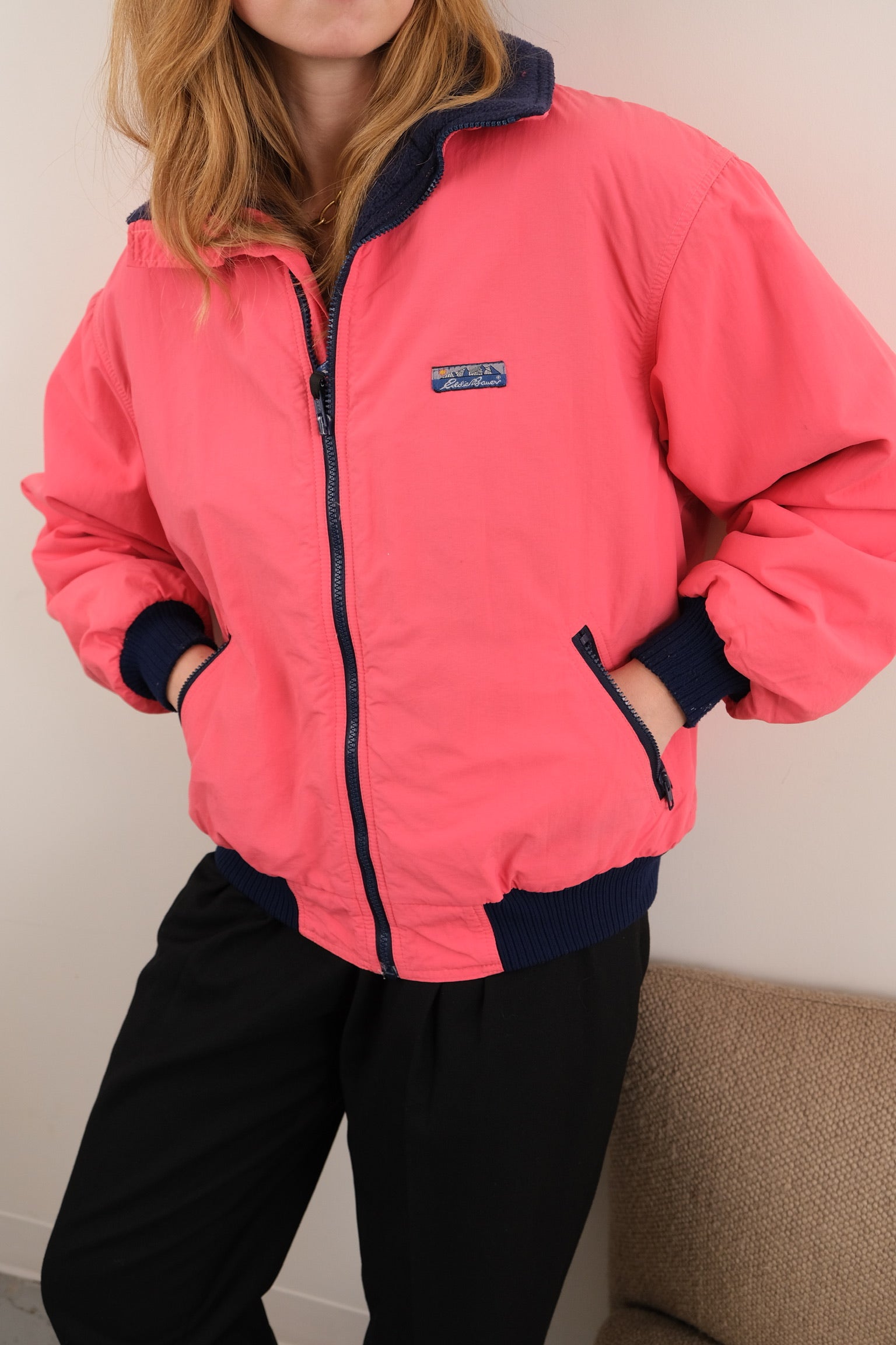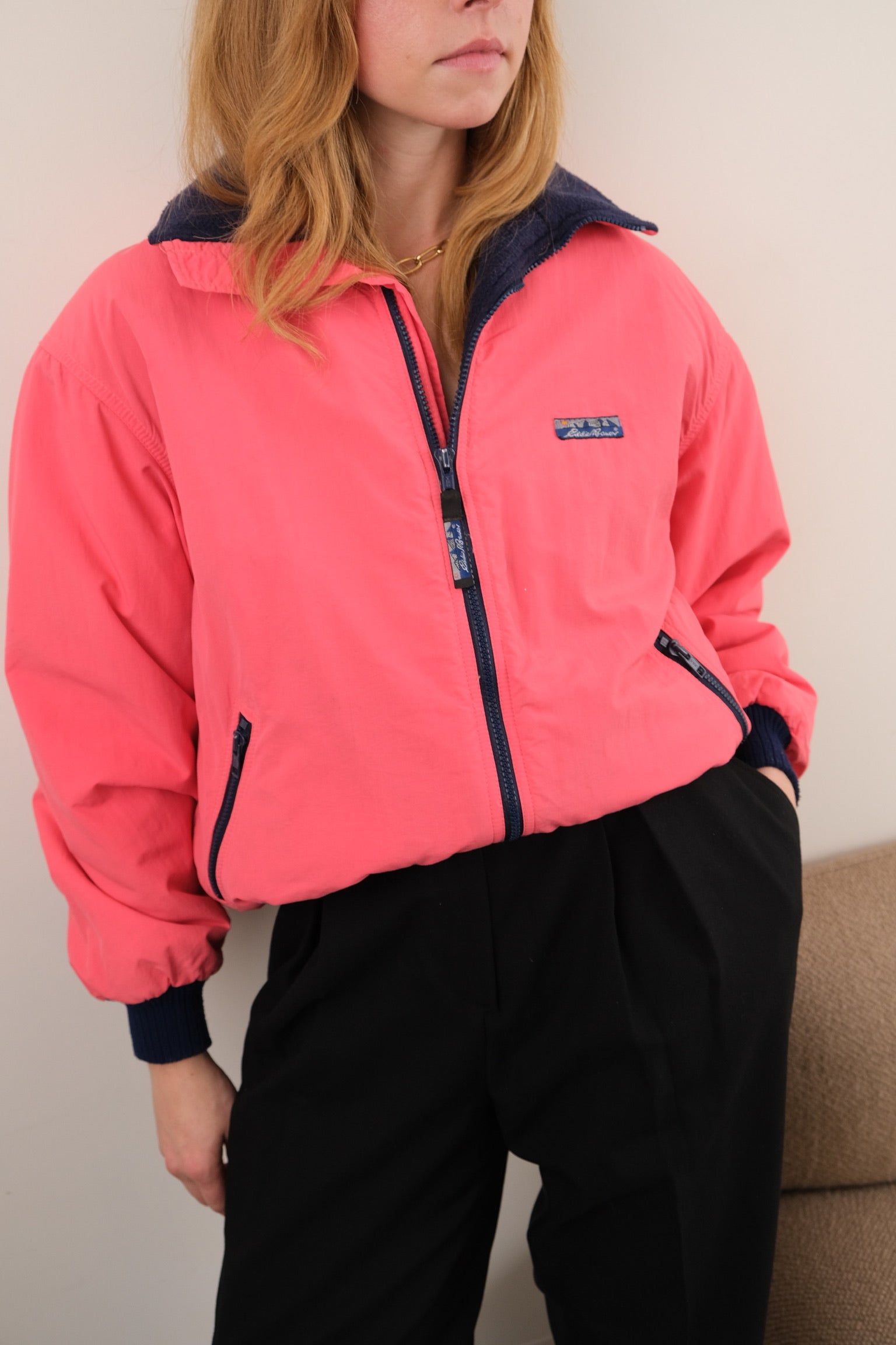 This coral nylon jacket has a slightly boxy silhouette with a full zip front and a soft fleece lining. It features a contrast navy collar, ribbed cuffs and hem, and angled zip pockets with a small chest logo patch.