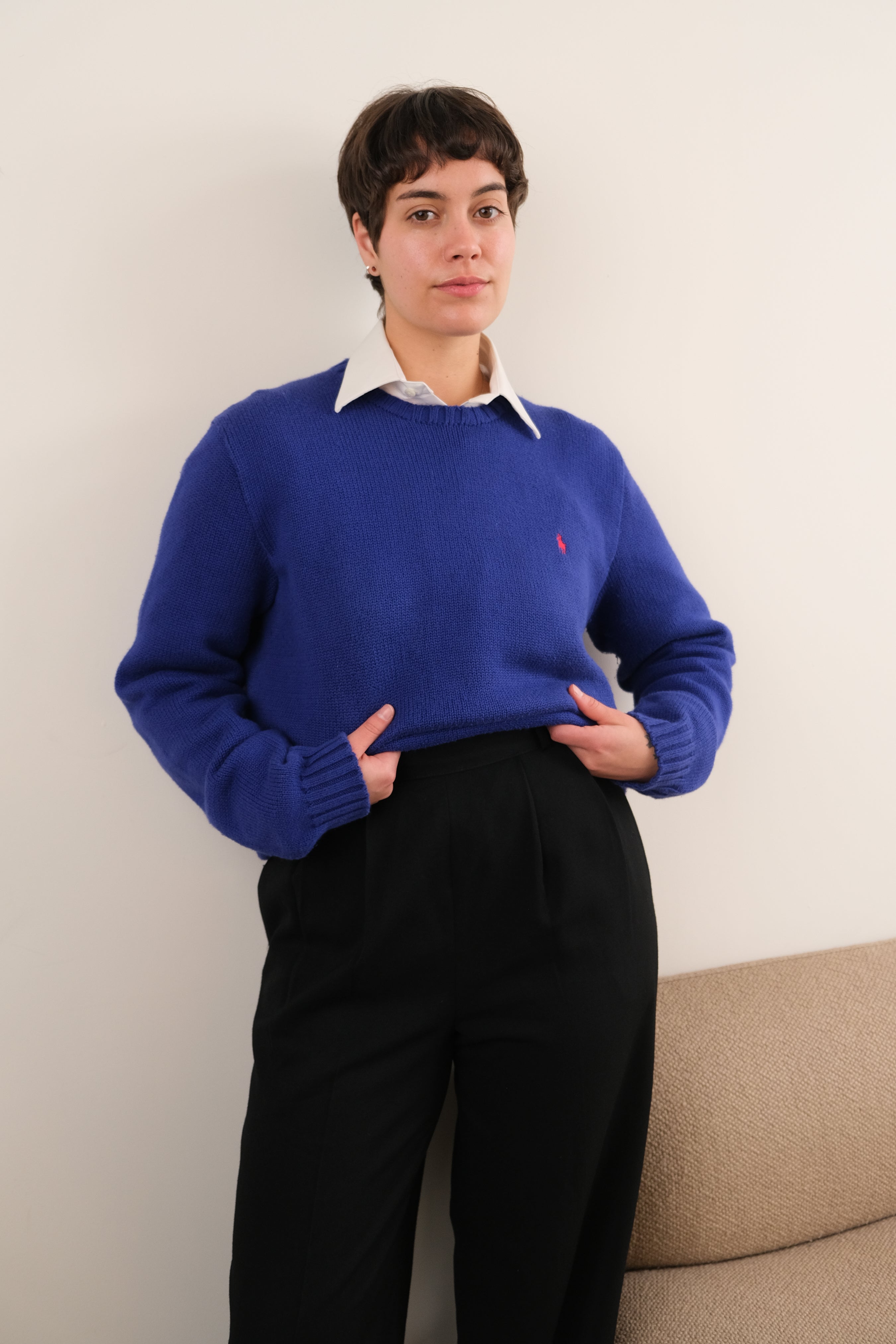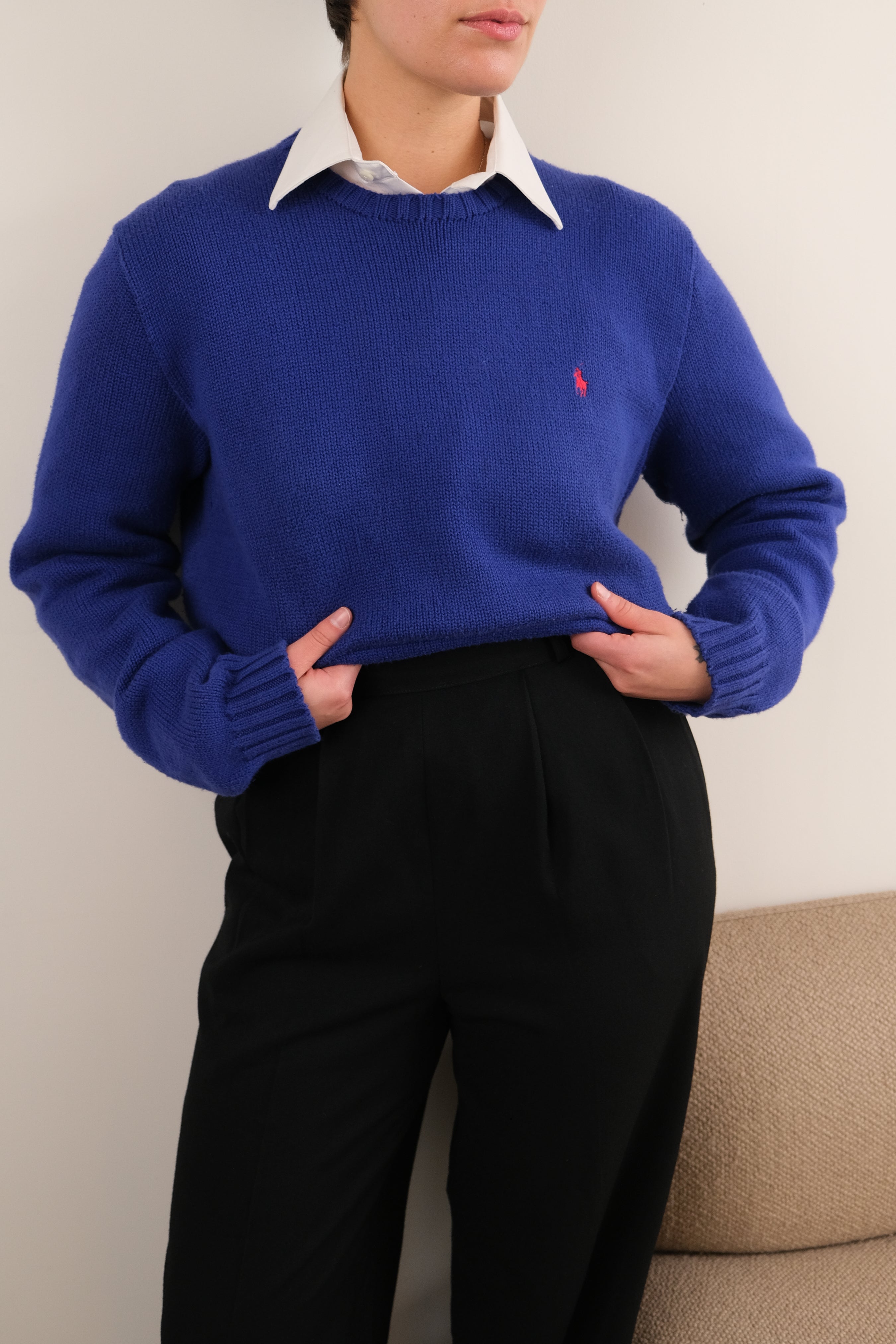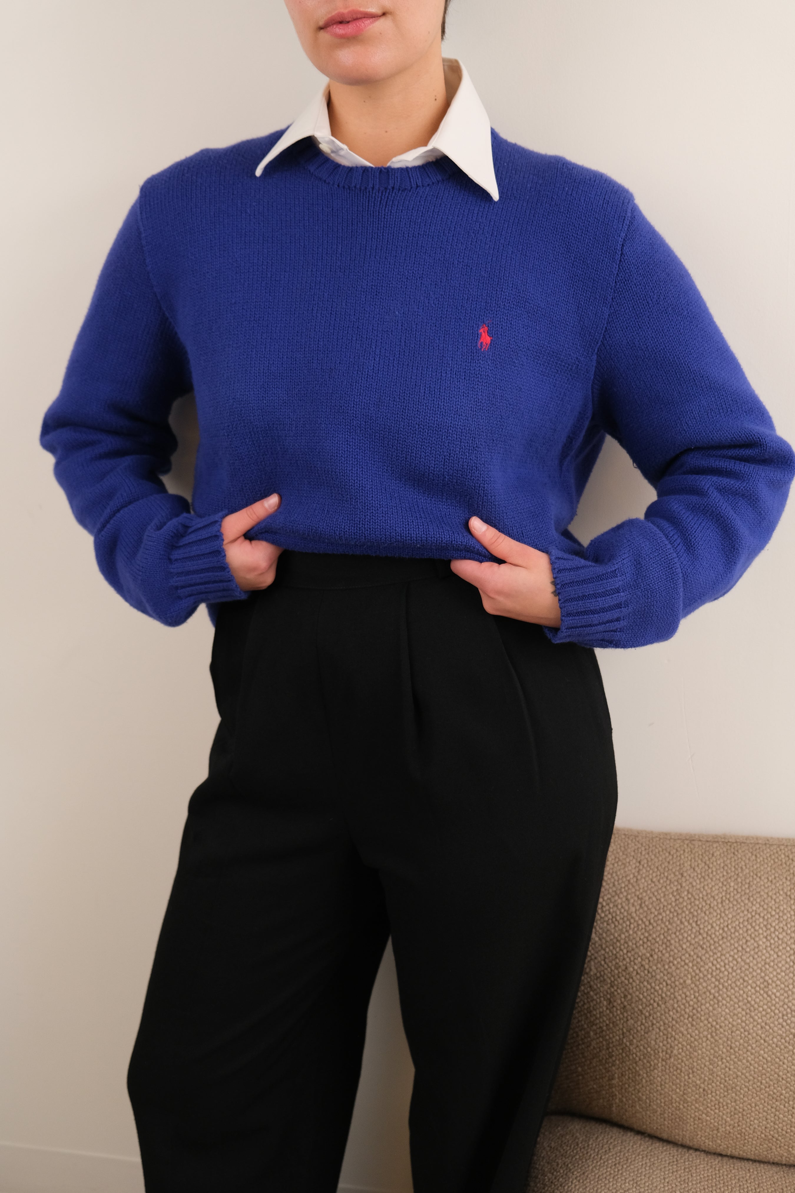 In rich purplish blue cotton, this sweater offers a midweight and smooth feel. It features a crew neckline, ribbed cuffs and hem, and tonal red polo rider embroidery at the chest. The silhouette is relaxed yet structured, ideal for layering or wearing on its own.
