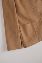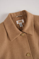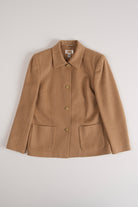Rendered in tan 100% wool, this jacket has a softly structured, midweight feel. Cut with a pointed collar, three-button front, and spacious patch pockets, the silhouette balances refined tailoring with everyday utility. Fully lined for smooth wear, it offers an easy, straight fit. A small faint mark near the mid-front adds to its vintage story and is reflected in the price.