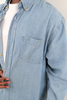 In light blue cotton denim, this shirt has a soft, breathable feel with a gently broken-in texture that reads easy and understated. Cut with a relaxed, straight silhouette, it features a button-down collar, long sleeves with barrel cuffs, a single chest pocket, and a curved shirttail hem.