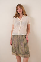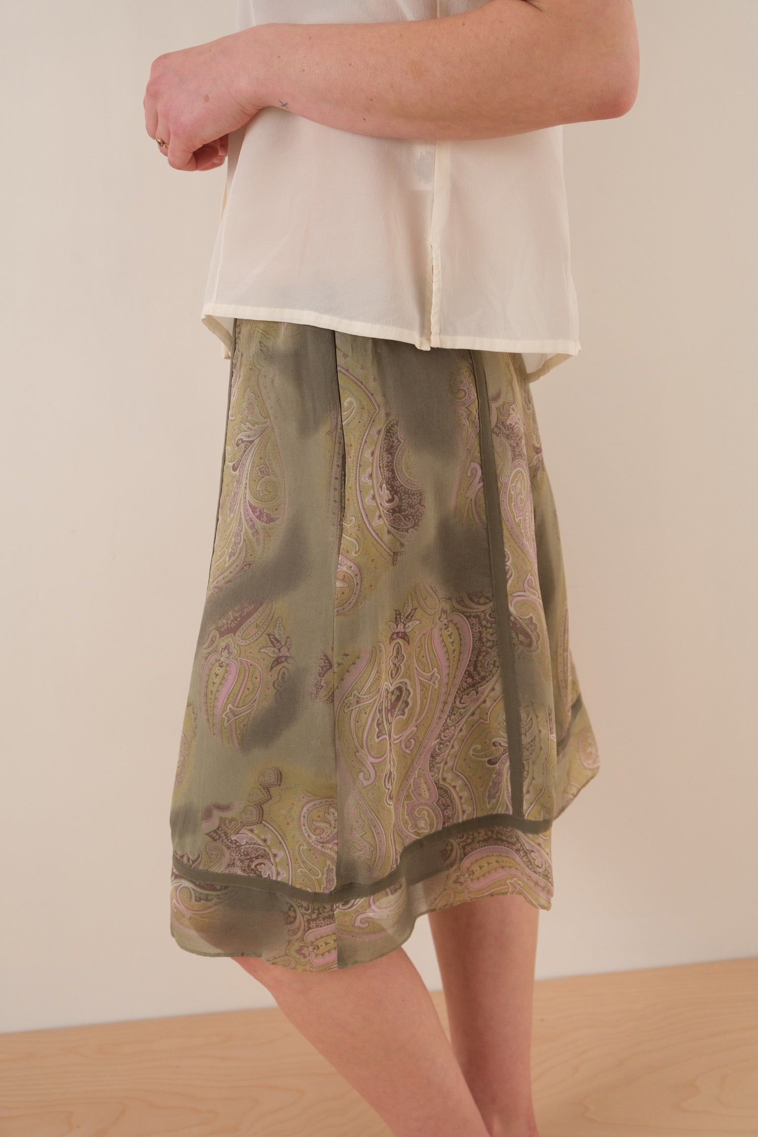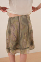 This olive green silk skirt features a lightweight, semi-sheer layered construction with a soft drape through a midi-length silhouette. Vertical seam paneling adds subtle structure, while the fluid outer layer reveals a tonal paisley pattern beneath. The overall effect is airy with gentle movement through the hem.