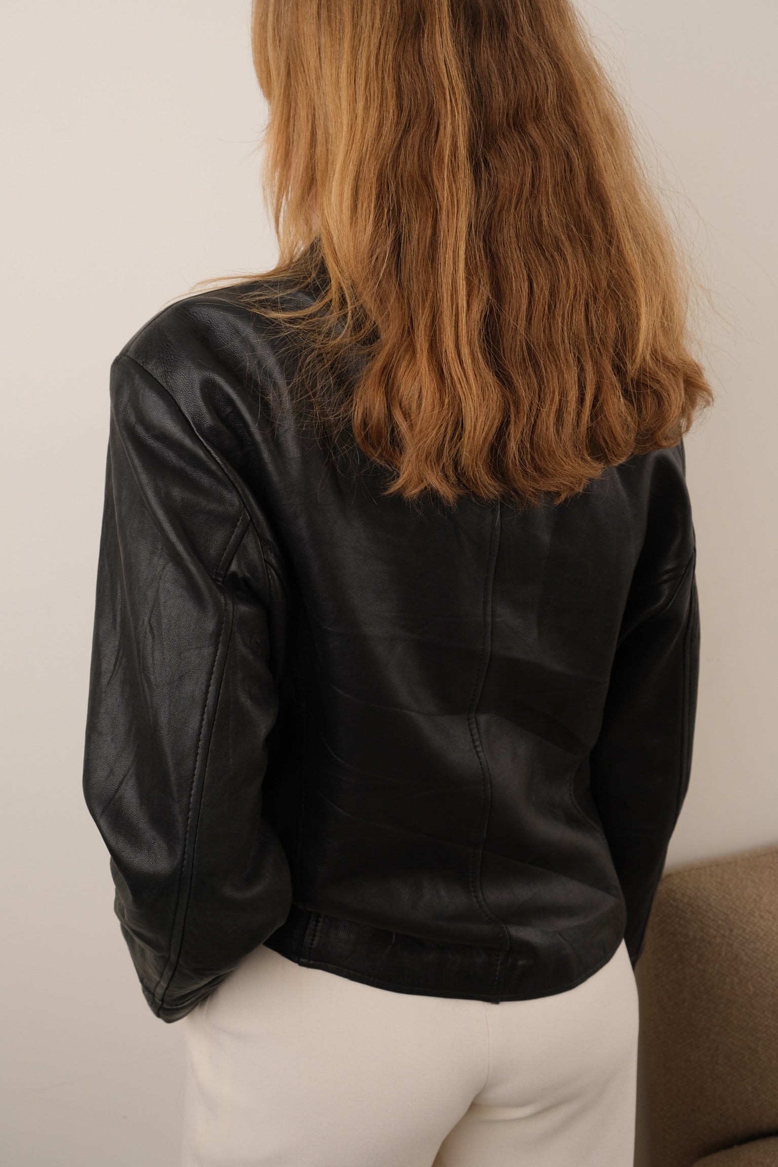 This black leather jacket is cut in a shaped silhouette with a pointed collar, front zip closure, zip chest pocket, and angled welt pockets. The leather is perfectly soft and broken-in.