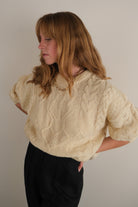 Cut in cream wool with a dense, weighty feel, this sweater showcases the traditional Aran-inspired cable motifs that lend both texture and heritage character. The knit pattern alternates between plaited braids and diamond forms, emphasizing the dimensional quality of the fabric. Ribbed trim at the collar, cuffs, and hem provides structure against the relaxed, easy drape. A small snag near the lower hem is present and reflected in the price.