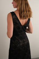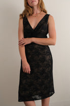 Rendered in black lace over a beige polyester lining, this dress carries a lightweight yet structured feel. The outer layer is patterned with an intricate floral motif, its semi-sheer finish lending depth and refinement. Cut with a plunging V-neckline, sleeveless frame, and gathered bust detail, the silhouette falls into a tailored midi length that flatters the form while remaining elegant. Fully lined with a concealed back zip, it offers both polish and ease of wear.
