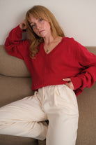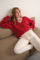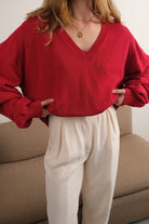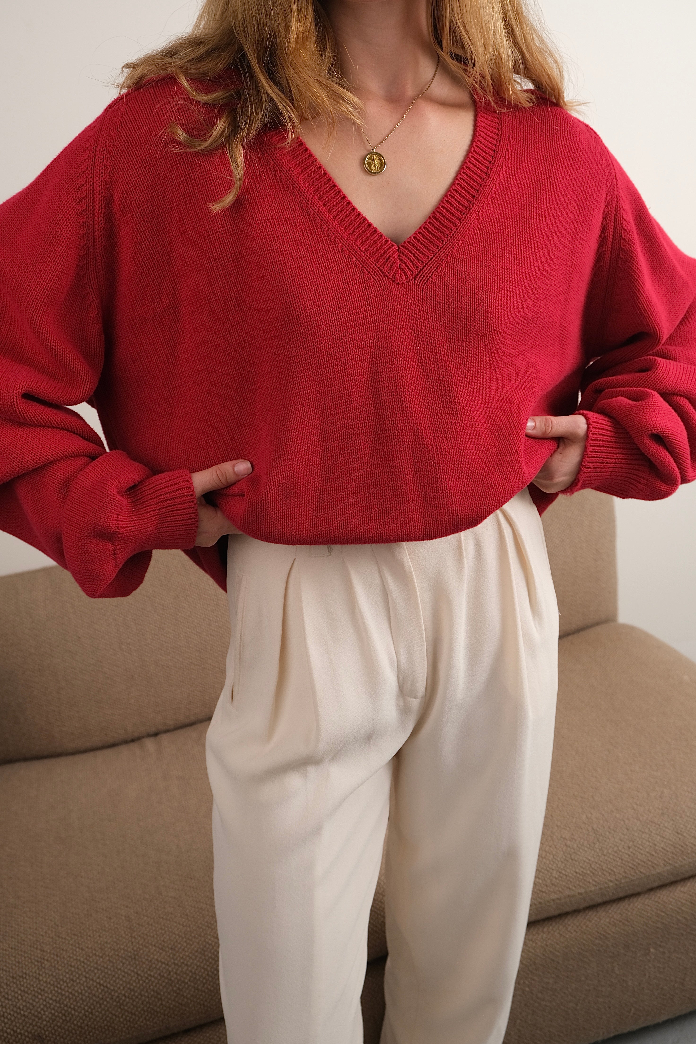 In bright red cotton, this sweater has a dense yet softly structured knit that balances weight and breathability. The V-neckline is framed by fine ribbing that continues through the cuffs and hem for a clean, tailored finish. Note: light blemish on front bottom, reflected in price.