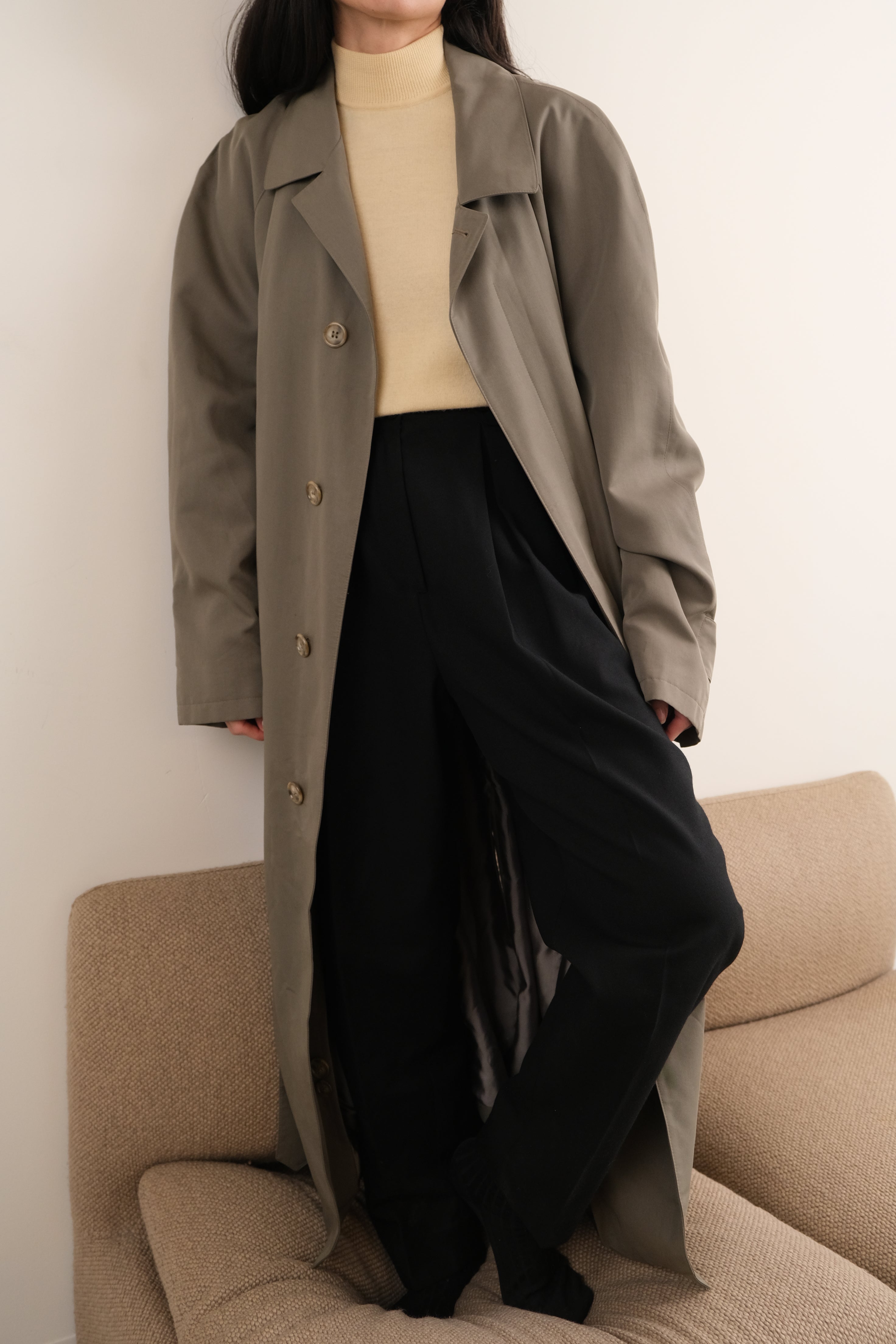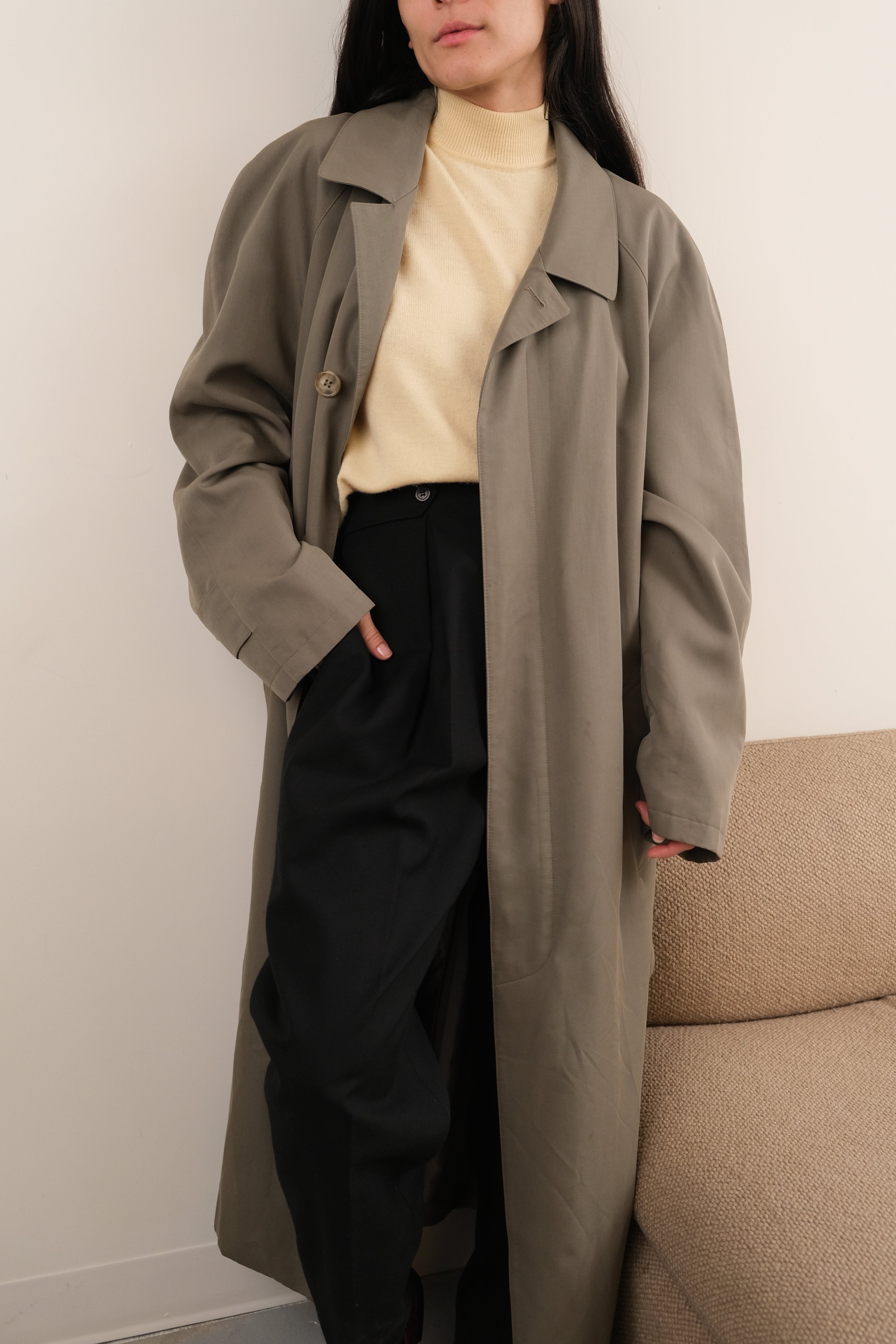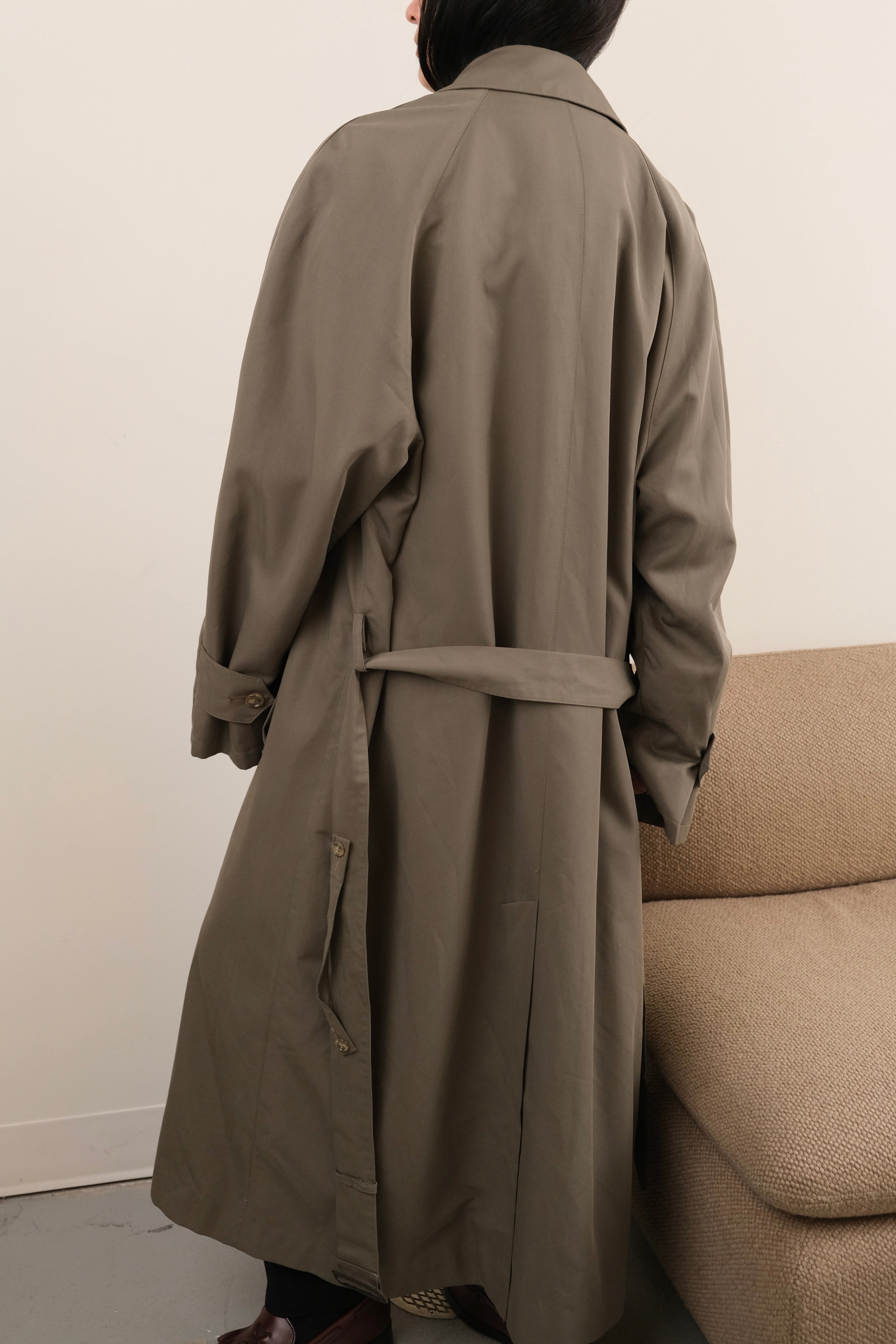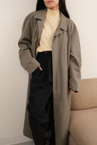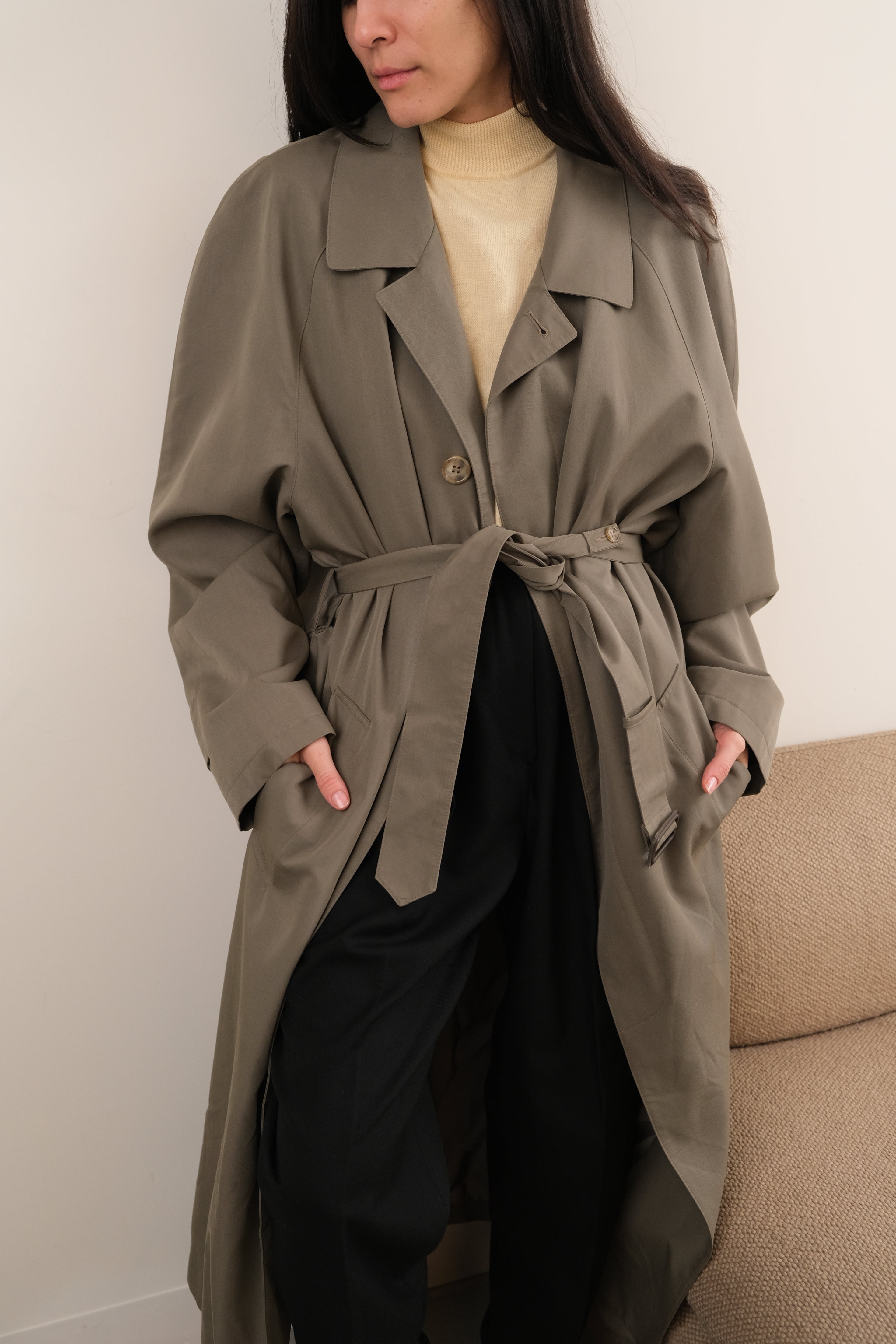In taupe woven fabric with a smooth, midweight feel, this coat offers an easy drape with a clean, uninterrupted front and simple welt pockets. Designed with a raglan sleeve, full button front, and a long self-belt, it shows a few faint marks on the front panel that do not distract from its overall structure.