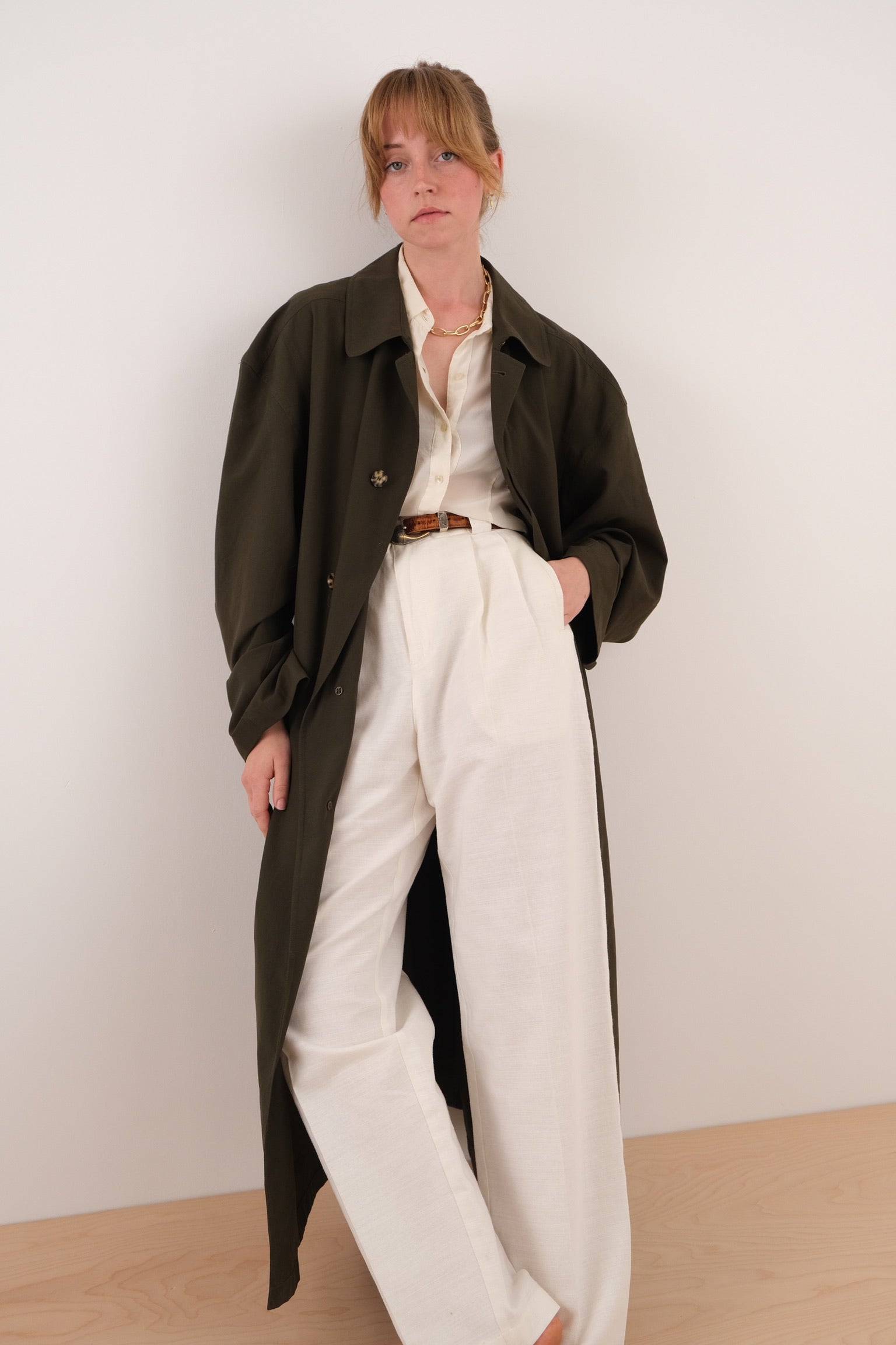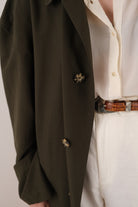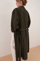 Dark green polyester coat with a relaxed silhouette and smooth, structured drape. Features a pointed collar, front button closure, and a self-tie belt with wide sleeves and adjustable cuff tabs.