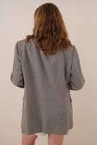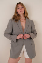 This grey wool blend blazer features a longline silhouette with a structured shoulder, notched lapel, and three-button front closure. It has flap pockets at the waist and a welt chest pocket, with a smooth woven surface and lightly tailored shape. Note: A faint mark is visible on the front left side.