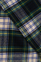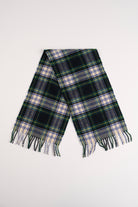 Rendered in navy, forest green, and cream 100% pure new wool, this scarf offers a soft yet substantial hand typical of traditional Scottish weaving. Its balanced tartan pattern is accented by fine yellow and royal blue overlines, lending both depth and vibrancy to the classic check. Finished with hand-twisted fringe edges, the fabric carries gentle warmth without bulk—ideal for layering through cool seasons.