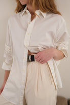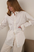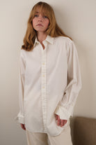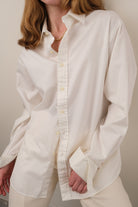 White cotton button-down shirt with a relaxed silhouette and smooth woven texture. Designed with a pointed collar, front button closure, and an embroidered chest logo.