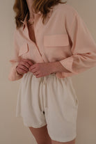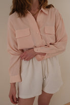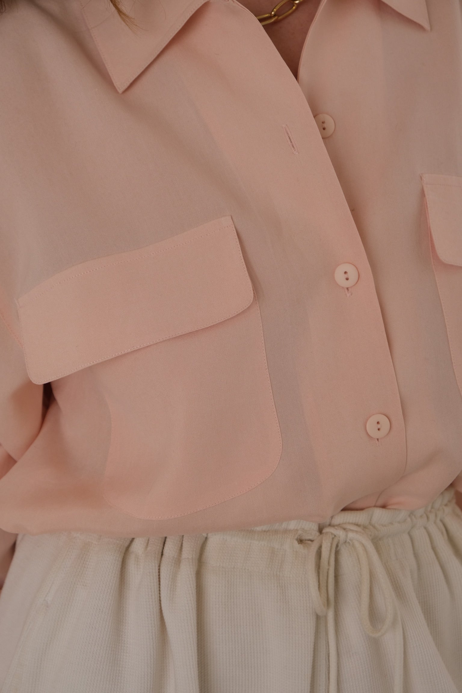 This blush silk blouse features a relaxed silhouette with a pointed collar and full front button closure. The smooth silk fabric has a soft drape, finished with two front flap pockets and a clean, fluid structure. The overall look is minimal with subtle utility references through the pocket detailing.