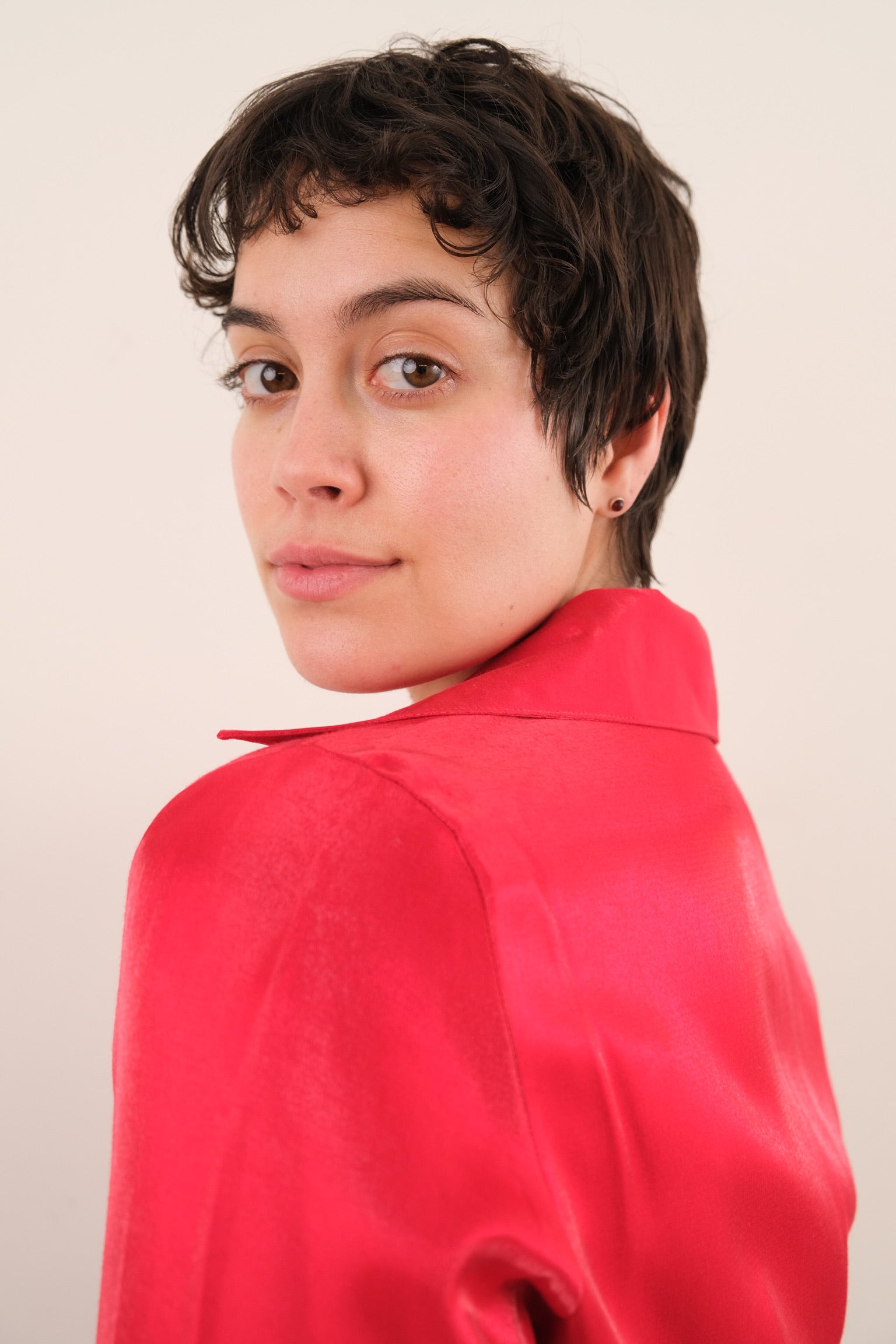 In red rayon blend, this blouse has a smooth, fluid feel with a soft sheen that gives the color a vivid, polished presence. Cut with a gently contoured silhouette, it features a pointed collar, long sleeves with buttoned cuffs, and a clean button-up front that reads refined and streamlined.