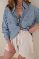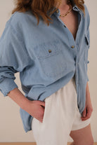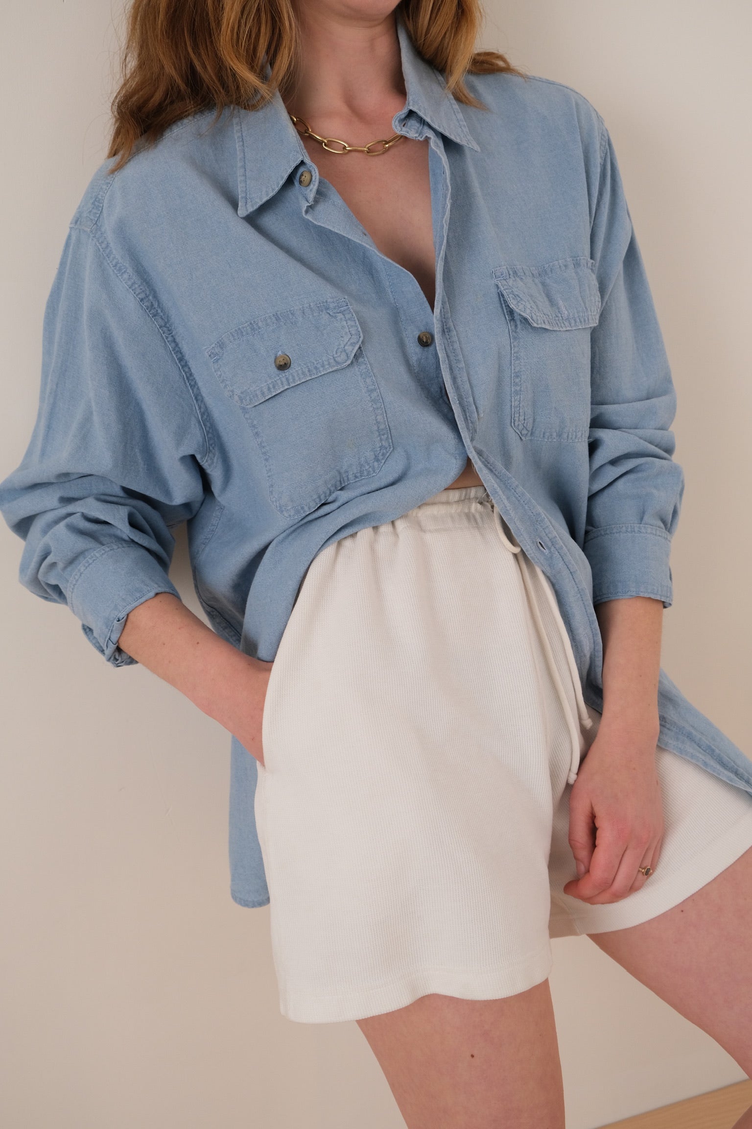 Light blue cotton shirt with a soft, lightweight chambray construction and a relaxed silhouette. Features a pointed collar, full front button closure, and two chest flap pockets with button closures. Light discoloration throughout shirt, adds character.