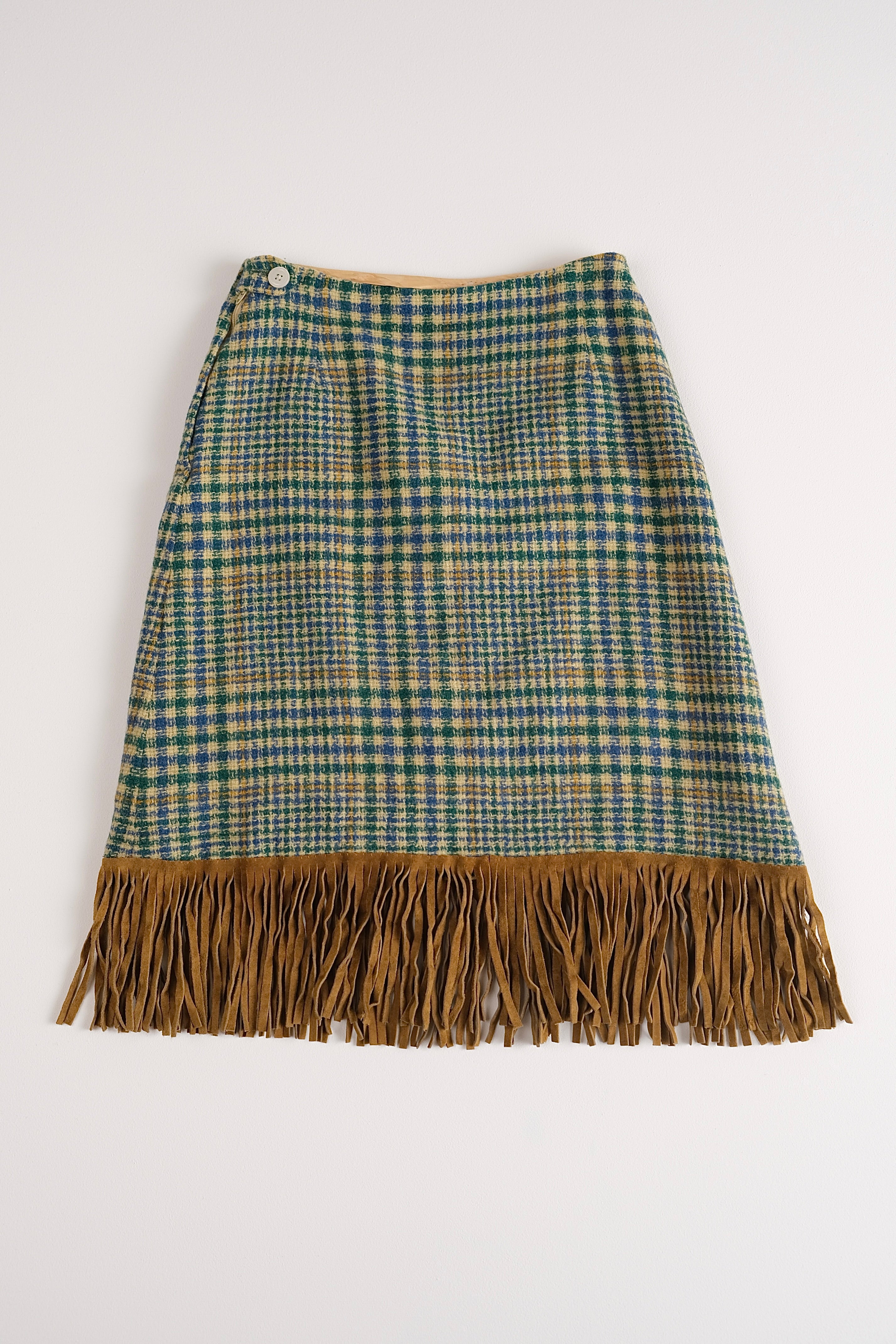 This mid-century pencil skirt features a bold yellow, blue, and green houndstooth pattern, cut from soft, medium-weight wool with a smooth satin lining for structure and ease. The suede fringe hem adds a striking Western-inspired touch, introducing movement and texture to the tailored silhouette. A hidden side zip and button closure complete the piece with period authenticity.