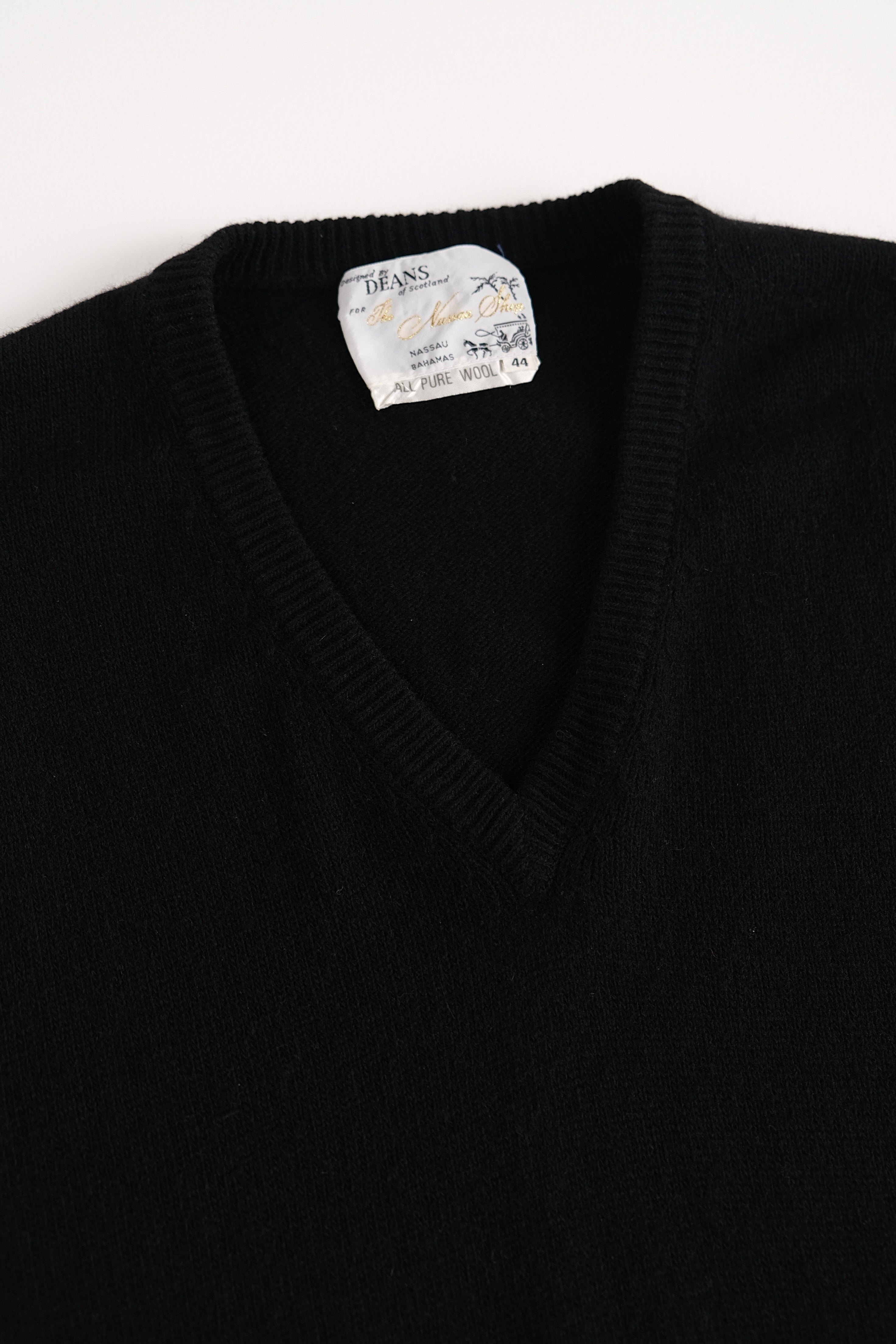 Rendered in true black 100% pure wool, this sleeveless sweater carries a soft yet weighty hand, characteristic of mid-century Scottish knitwear. The V-neckline and ribbed trims at the arms and hem lend quiet structure to its naturally draping form. Designed by Deans of Scotland for The Nassau Shop of the Bahamas, it exemplifies cross-Atlantic craftsmanship from a boutique heritage maker known for quality woolens. The knit remains supple with no visible pilling or flaws, suggesting careful preservation over time.