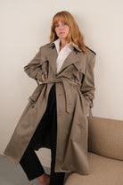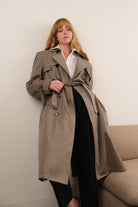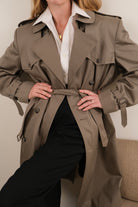 In a classic taupe brown cotton blend, this coat has a smooth, structured feel with a full satin interior and a removable plush lining for added warmth. Designed with a double breasted front, storm flap, welt and flap pockets, and a matching belt, it offers a clean, traditional trench silhouette.