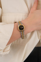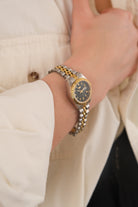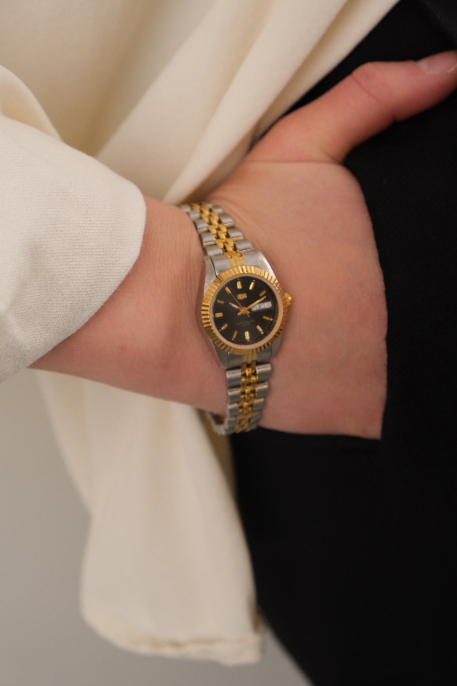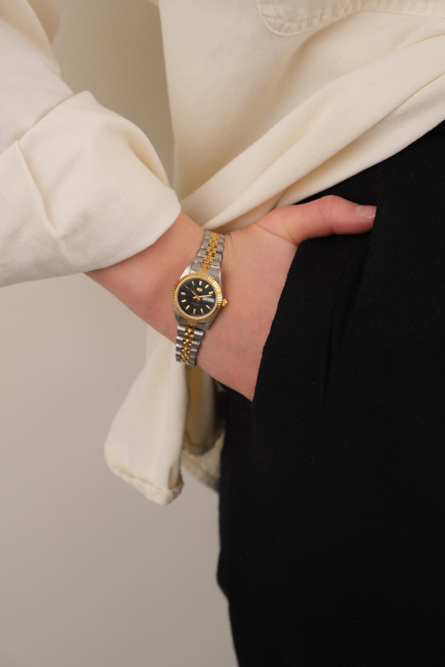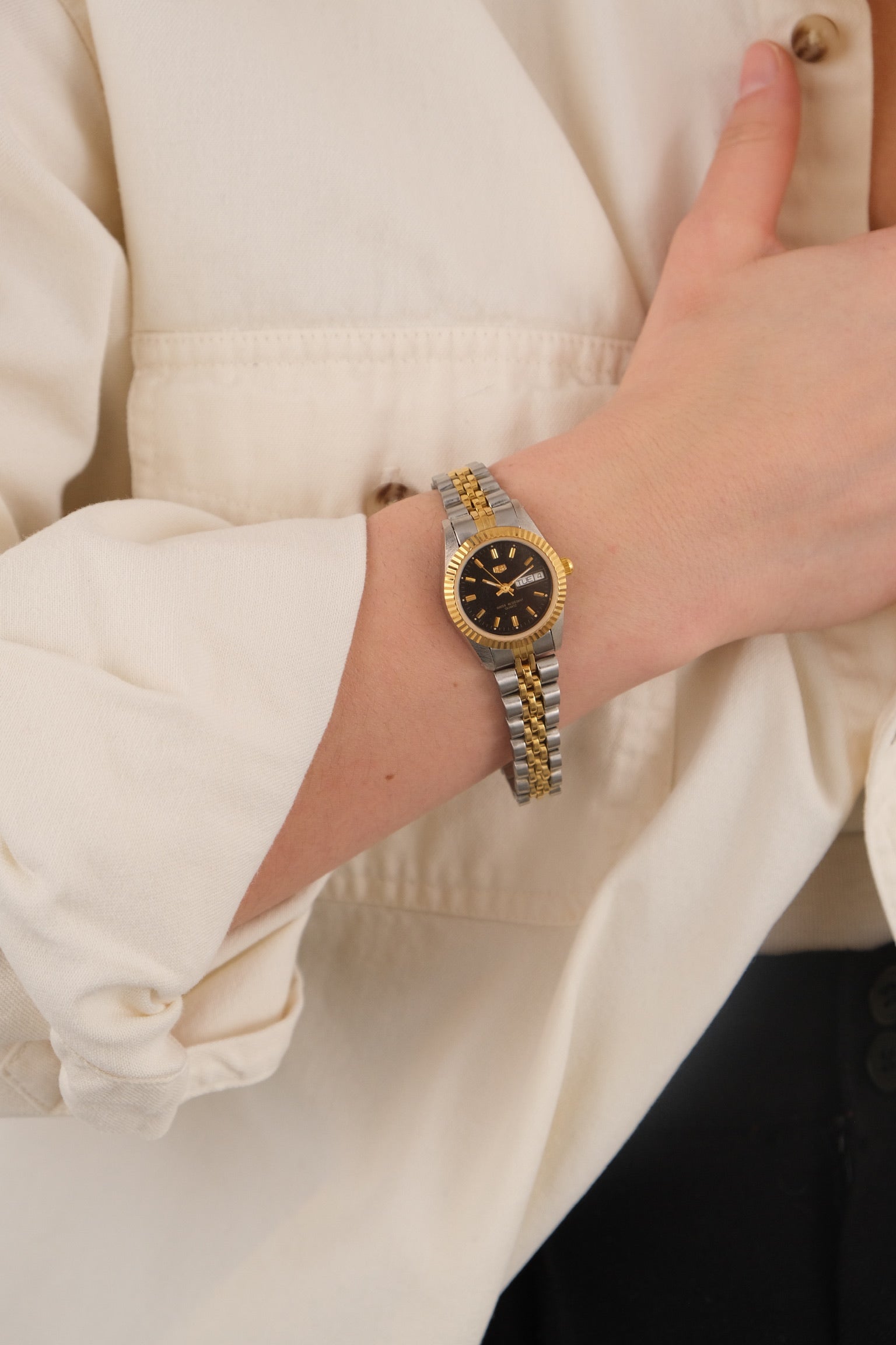 This vintage quartz watch features a silver- and gold-tone metal construction with a compact round case and a flexible slip-on bracelet. The dial is clean and minimal, framed by a polished bezel that keeps the overall presentation restrained and classic. The expandable band allows for easy wear and a close fit at the wrist.