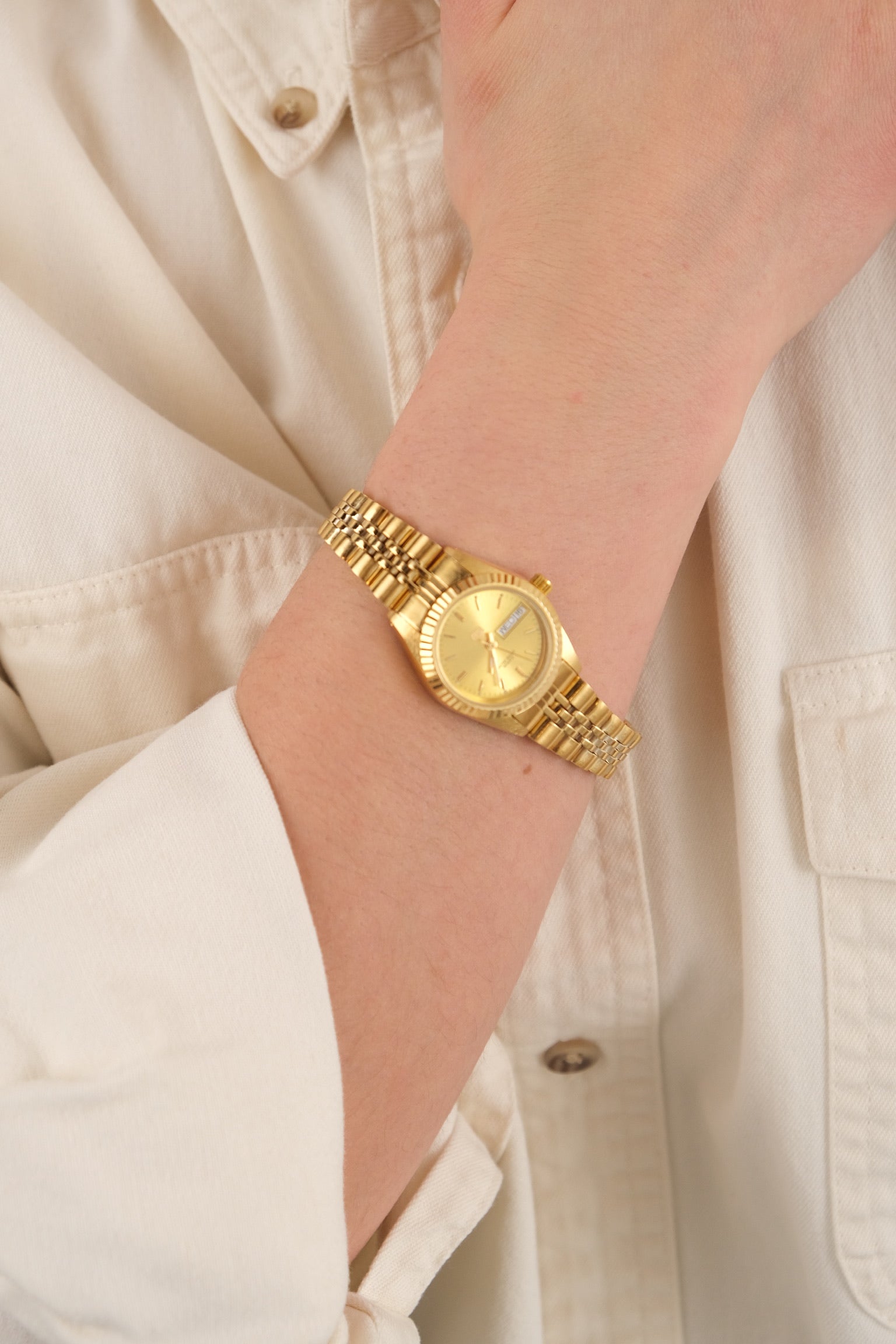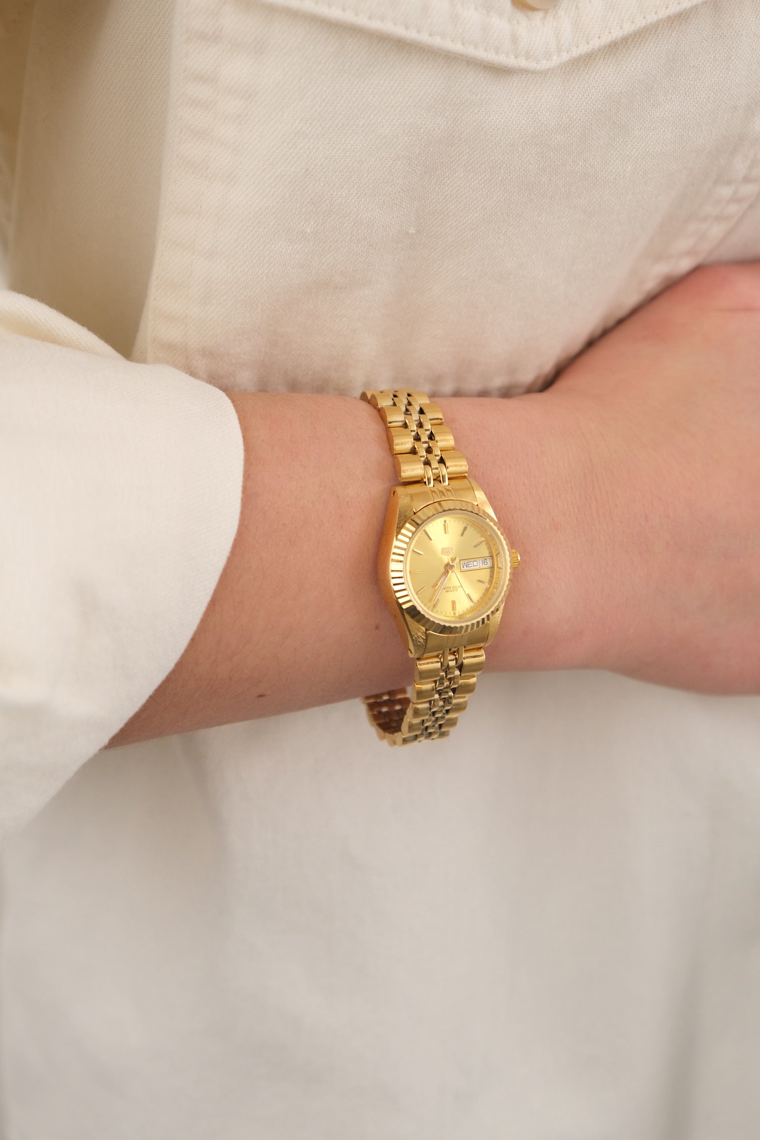This vintage quartz watch features an all gold-tone metal construction with a compact round case and a flexible slip-on bracelet. The dial is clean and minimal, framed by a polished bezel that keeps the overall presentation restrained and classic. The expandable band allows for easy wear and a close fit at the wrist.