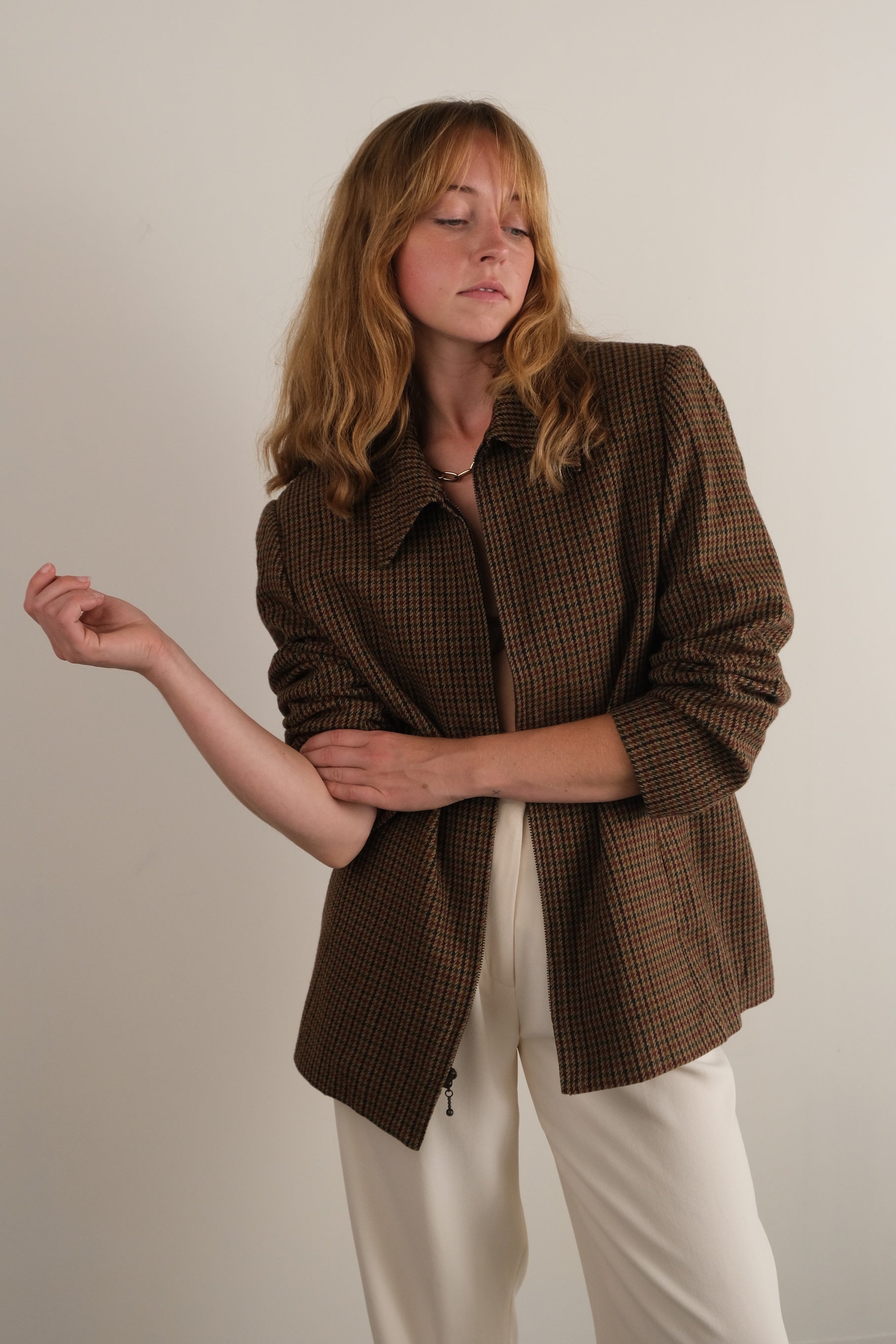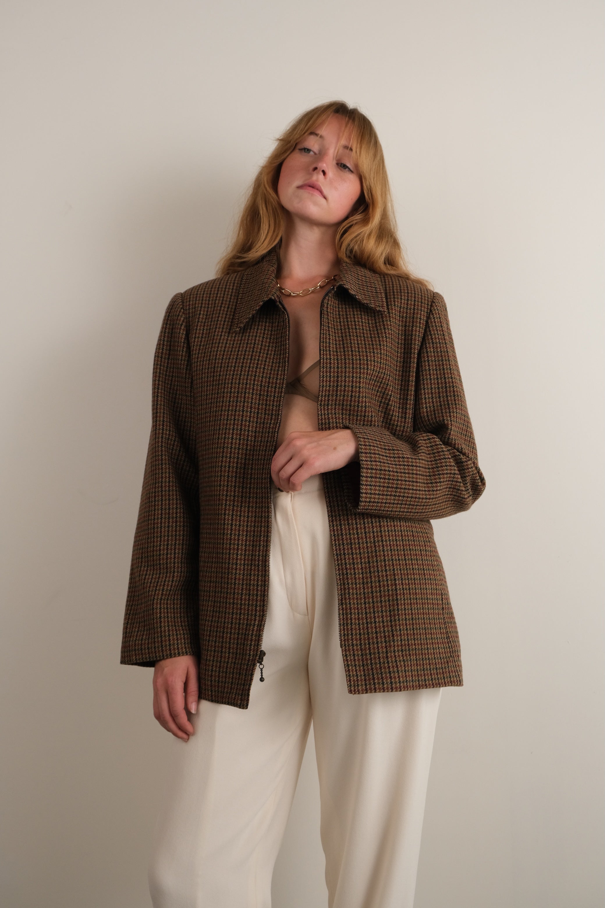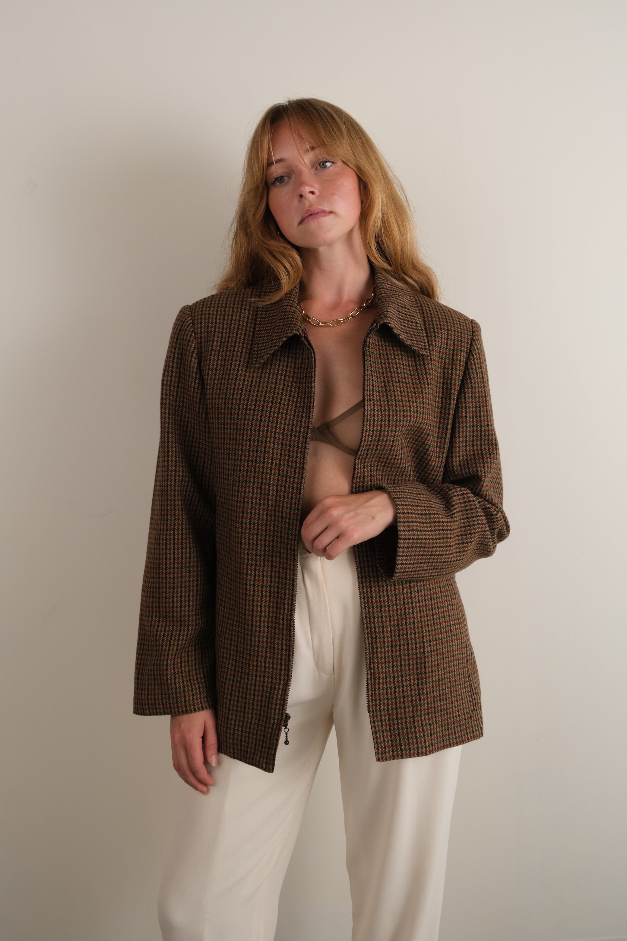 Vintage 90s Houndstooth Wool Blend Zip Up Jacket