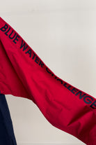 Rendered in navy cotton and nylon blend with vivid red sleeves, this jacket has a durable yet flexible feel. Bold lettering runs along each arm adding graphic edge to its nautical spirit. Designed with a zip front concealed by a button placket, two angled side pockets, and oversized flap pockets with button closures, it is finished with a stand collar with hideaway hood, and mesh lining for breathability.