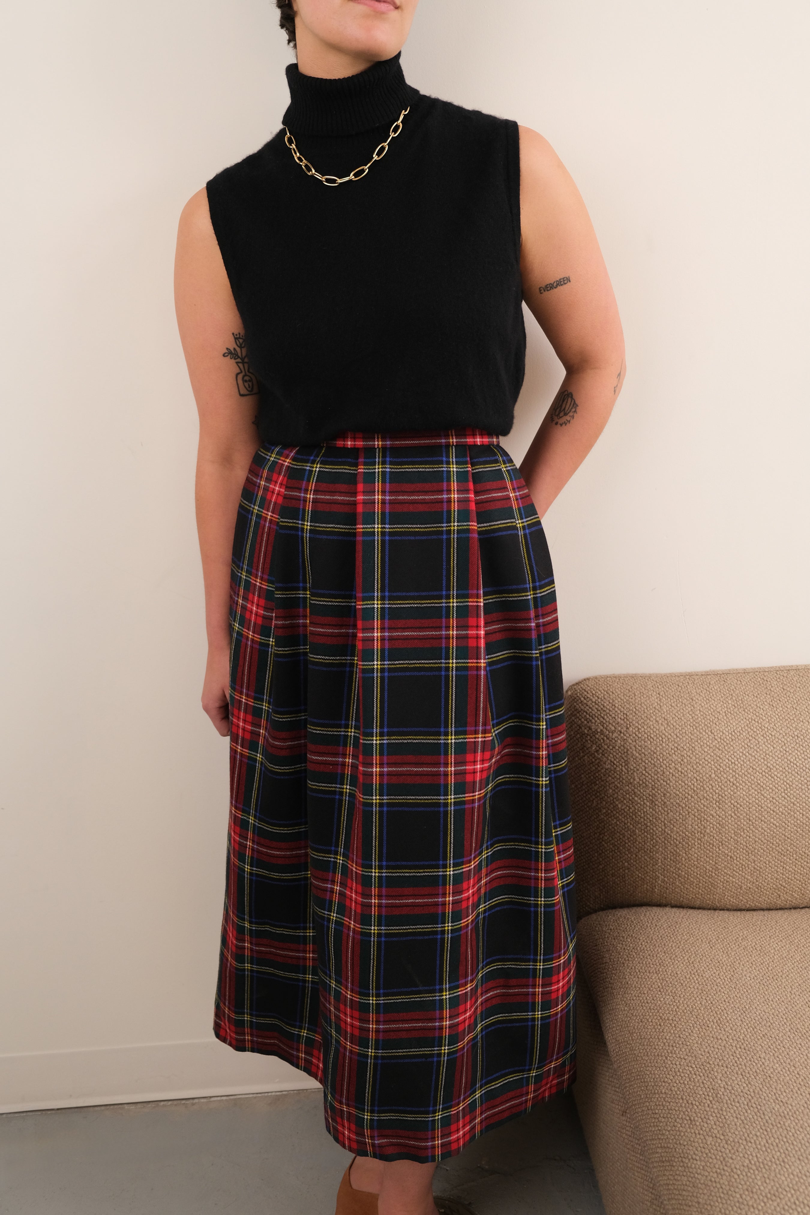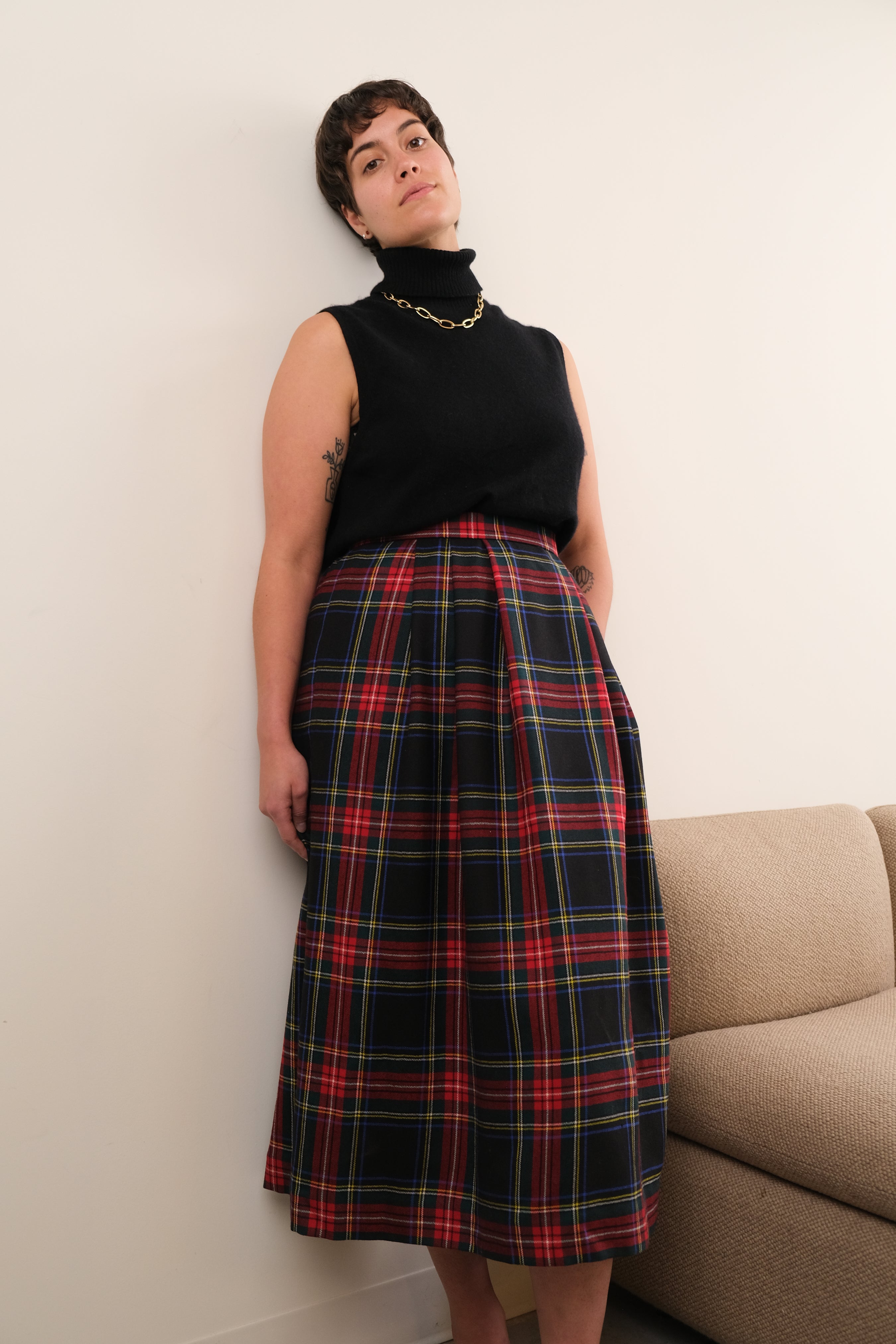 Woven in rich red wool with a classic tartan pattern, this skirt carries a structured drape with full pleating through the body. It fastens with a side button and hidden clasp closure, fully lined in smooth acetate for comfort and movement. Note: Small holes on front pleat, reflected in price.