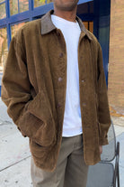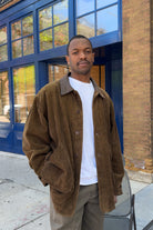 Tailored from thick cotton corduroy in a warm umber shade, this jacket is detailed with a genuine leather collar that has developed a lived-in patina. A plaid lining adds comfort and visual interest, while two oversized patch pockets provide practical utility. Its button front closure and straight cut make it a versatile outer layer with a heritage feel.